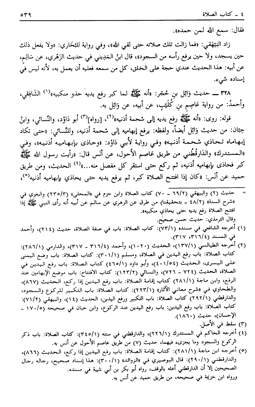 2 أخرجه الطيالسي "1/137"، الحديث "0 2 0 1"، وأحمد "4/6 31- 317"، والد ارمي "1/286": كتاب الصلاة: باب رفع اليدين في الصلاة، ومسلم "1/301": كتاب الصلاة: باب وضع اليمنى على اليسرى، الحديث "54/401"، وأبو داود "1/465" كتاب الصلاة: باب رفع اليدين في الصلاة، الحديث "724- 726"، والنسائي "2/123": كتاب الافتتاح: باب موضع الإبهامين عند الرفع، وابن ماجة "1/281" كتاب إقامة الصلاة: باب رفع اليدين إذا ركع، الحديث "867"، والطحاوي في "شرح معاني الآثار" "1/223": كتاب الصلاة: باب التكبير للركوع والسجود، والدارقطني "1/292" كتاب الصلاة: باب التكبير ورفع اليدين، الحديث "14"، والبيهقي "2/71": كتاب الصلاة: باب رفع اليدين: باب رفع اليدين عند الركوع، وابن حبان في صحيحه "5/170-الإحسان"، حديث "1860".