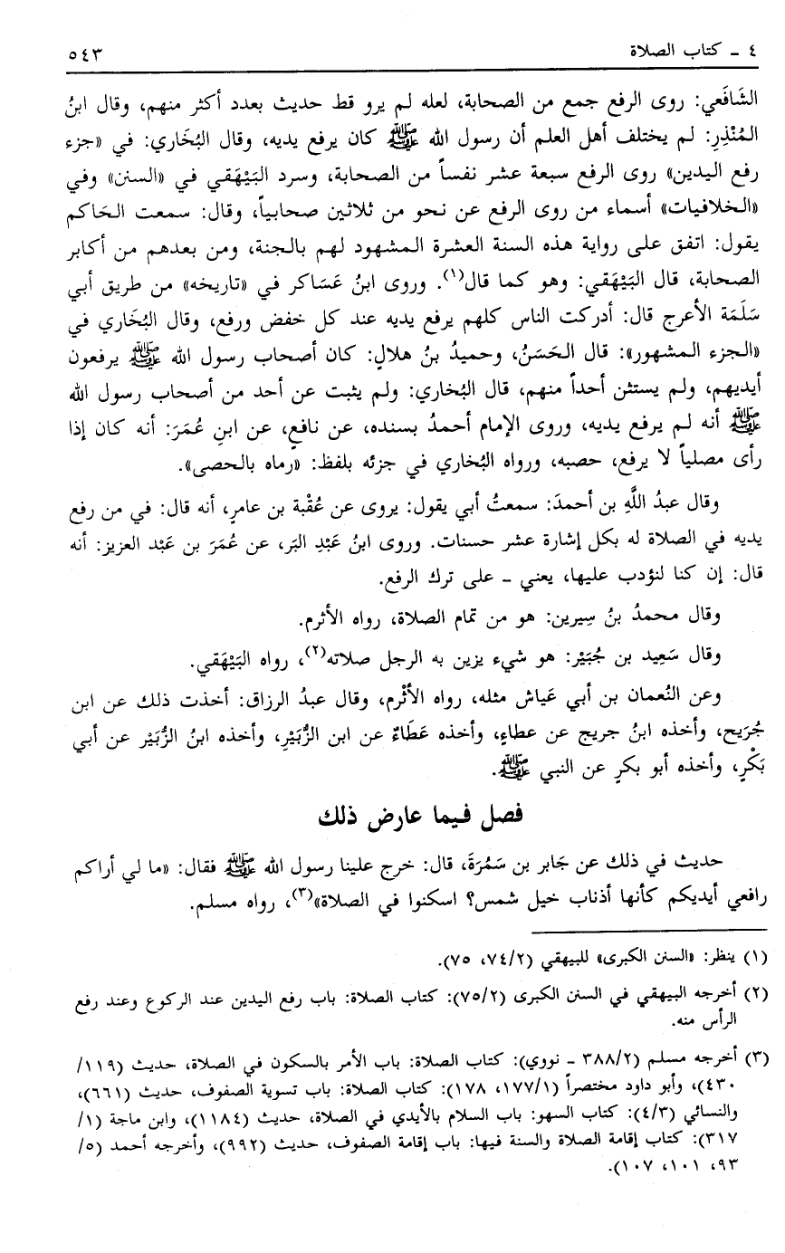 الشَّافِعِيُّ: رَوَى الرَّفْعَ جَمْعٌ مِنْ الصَّحَابَةِ لَعَلَّهُ لَمْ يُرْوَ قَطُّ حَدِيثٌ بِعَدَدٍ أَكْثَرَ مِنْهُمْ وَقَالَ ابْنُ الْمُنْذِرِ: لَمْ يَخْتَلِفْ أَهْلُ الْعِلْمِ أَنَّ رَسُولَ اللَّهِ صَلَّى اللَّهُ عَلَيْهِ وَسَلَّمَ كَانَ يَرْفَعُ يَدَيْهِ وَقَالَ الْبُخَارِيُّ: فِي جُزْءِ رَفَعَ الْيَدَيْنِ رَوَى الرَّفْعَ سَبْعَةَ عَشَرَ نَفْسًا مِنْ الصَّحَابَةِ وَسَرَدَ الْبَيْهَقِيُّ فِي السُّنَنِ وَفِي الْخِلَافِيَّاتِ أَسْمَاءَ مَنْ رَوَى الرَّفْعَ عَنْ نَحْوٍ مِنْ ثَلَاثِينَ صَحَابِيًّا وَقَالَ سَمِعْتُ الْحَاكِمَ يَقُولُ اتَّفَقَ عَلَى رِوَايَةِ هَذِهِ السُّنَّةِ الْعَشَرَةُ الْمَشْهُودُ لَهُمْ بِالْجَنَّةِ وَمَنْ بَعْدَهُمْ مِنْ أَكَابِرِ الصَّحَابَةِ قَالَ الْبَيْهَقِيُّ وَهُوَ كَمَا قَالَ1 وَرَوَى ابْنُ عَسَاكِرَ فِي تَارِيخِهِ مِنْ طَرِيقِ أَبِي سَلَمَةَ الْأَعْرَجِ قَالَ أَدْرَكْتُ النَّاسَ كُلُّهُمْ يَرْفَعُ يَدَيْهِ عِنْدَ كُلِّ خَفْضٍ وَرَفْعٍ وَقَالَ الْبُخَارِيُّ فِي الْجُزْءِ الْمَشْهُورِ قَالَ الْحَسَنُ وَحُمَيْدُ بْنُ هِلَالٍ كَانَ أَصْحَابُ رَسُولِ اللَّهِ صَلَّى اللَّهُ عَلَيْهِ وَسَلَّمَ يَرْفَعُونَ أَيْدِيَهُمْ وَلَمْ يَسْتَثْنِ أَحَدًا مِنْهُمْ قَالَ الْبُخَارِيُّ وَلَمْ يَثْبُتْ عَنْ أَحَدٍ مِنْ أَصْحَابِ رَسُولِ اللَّهِ صَلَّى اللَّهُ عَلَيْهِ وَسَلَّمَ أَنَّهُ لَمْ يَرْفَعْ يَدَيْهِ وَرَوَى الْإِمَامُ أَحْمَدُ بِسَنَدِهِ عَنْ نَافِعٍ عَنْ ابْنِ عُمَرَ أَنَّهُ كَانَ إذَا رَأَى مُصَلِّيًا لَا يَرْفَعُ حَصَبَهُ وَرَوَاهُ الْبُخَارِيُّ فِي جُزْئِهِ بِلَفْظِ: رَمَاهُ بِالْحَصَى.