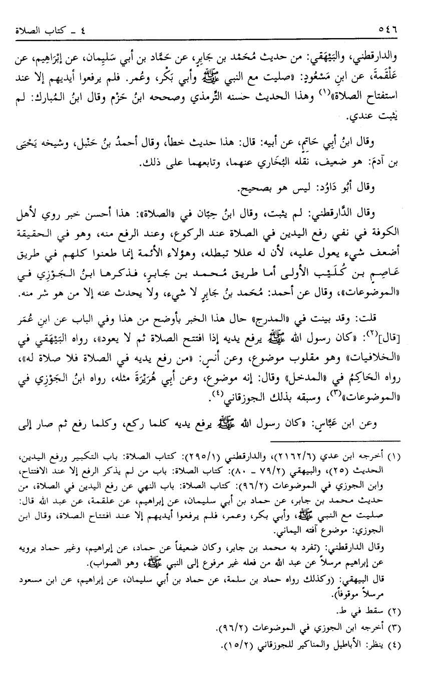 1 أخرجه ابن عدي "6/2162"، والدارقطني "1/295": كتاب الصلاة: باب التكبير ورفع اليدين، الحديث "25"، والبيهقي "2/79- 80": كتاب الصلاة: باب من لم يذكر الرفع إلا عند الافتتاح، وابن الجوزي في الموضوعات "2/96": كتاب الصلاة: باب النهي عن رفع اليدين في الصلاة، من حديث محمد بن جابر، عن حماد بن أبي سليمان، عن إبراهيم، عن علقمة، عن عبد اللَّه قال: صليت مع النبي صَلَّى اللَّهُ عَلَيْهِ وَسَلَّمَ، وأبي بكر، وعمر، فلم يرفعوا أيديهم إلا عند افتتاح الصلاة، وقال ابن الجوزي: موضوع آفته اليماني.