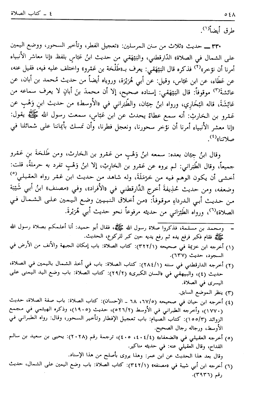 330 - حَدِيثُ: "ثَلَاثٌ مِنْ سُنَنِ الْمُرْسَلِينَ تَعْجِيلُ الْفِطْرِ وَتَأْخِيرُ السُّحُورِ وَوَضْعُ الْيَمِينِ عَلَى الشِّمَالِ فِي الصَّلَاةِ" الدَّارَقُطْنِيُّ وَالْبَيْهَقِيُّ مِنْ حَدِيثِ ابْنِ عَبَّاسٍ بِلَفْظِ: "إنَّا مَعَاشِرَ الْأَنْبِيَاءِ أُمِرْنَا أَنْ نُؤَخِّرَ" 2 فَذَكَرَهُ قَالَ الْبَيْهَقِيُّ: يُعْرَفُ بِطَلْحَةِ بْنِ عَمْرٍو وَاخْتُلِفَ عَلَيْهِ فِيهِ فَقِيلَ عَنْهُ عَنْ عَطَاءٍ عَنْ ابْنِ عَبَّاسٍ وَقِيلَ: عَنْ أَبِي هُرَيْرَةَ وَرَوَيَاهُ أَيْضًا مِنْ حَدِيثِ مُحَمَّدِ بْنِ أَبَانَ عَنْ عَائِشَةَ3 مَوْقُوفًا قَالَ الْبَيْهَقِيُّ: إسْنَادُهُ صَحِيحٌ إلَّا أَنَّ مُحَمَّدَ بْنَ أَبَانَ لَا يُعْرَفُ سَمَاعُهُ مِنْ عَائِشَةَ قال الْبُخَارِيُّ: وَرَوَاهُ ابْنُ حِبَّانَ وَالطَّبَرَانِيُّ فِي الْأَوْسَطِ مِنْ حَدِيثِ ابْنِ وَهْبٍ عَنْ عَمْرِو بْنِ الْحَارِثِ أَنَّهُ سَمِعَ عَطَاءً يُحَدِّثُ عَنْ ابْنِ عَبَّاسٍ سَمِعْتُ رَسُولَ اللَّهِ صَلَّى اللَّهُ عَلَيْهِ وَسَلَّمَ يَقُولُ: "إنَّا مَعْشَرَ الْأَنْبِيَاءِ أُمِرْنَا أَنْ نُؤَخِّرَ سُحُورَنَا وَنُعَجِّلَ فِطْرَنَا وَأَنْ نُمْسِكَ بِأَيْمَانِنَا عَلَى شَمَائِلِنَا فِي صَلَاتِنَا" 4