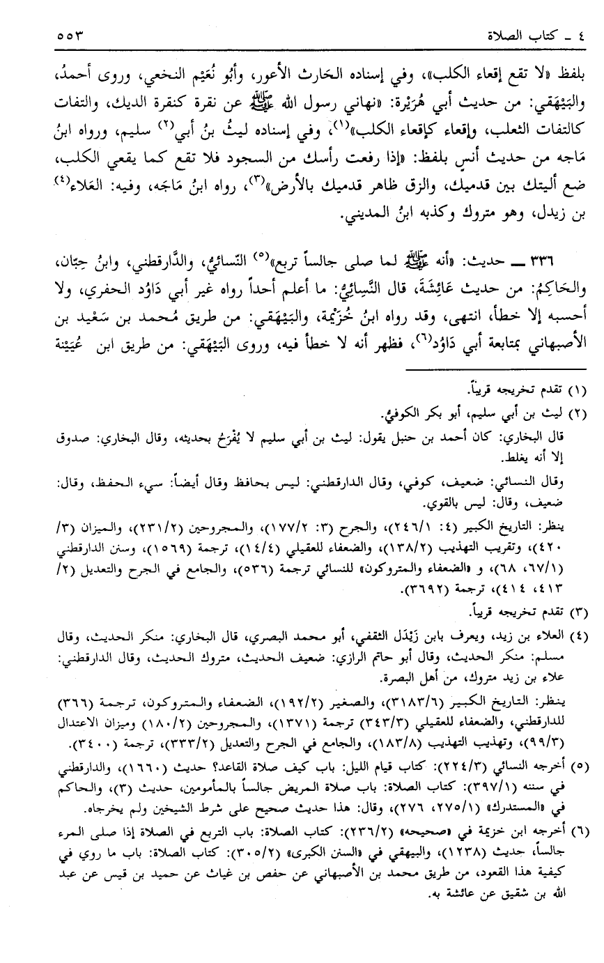 بِلَفْظِ: "لَا تُقْعِ إقْعَاءَ الْكَلْبِ" وَفِي إسْنَادِهِ الْحَارِثُ الْأَعْوَرُ وَأَبُو نُعَيْمٍ النَّخَعِيُّ وَرَوَى أَحْمَدُ وَالْبَيْهَقِيُّ: مِنْ حَدِيثِ أَبِي هُرَيْرَةَ نَهَانِي رَسُولُ اللَّهِ صَلَّى اللَّهُ عَلَيْهِ وَسَلَّمَ عَنْ نَقْرَةٍ كَنَقْرَةِ الدِّيكِ وَالْتِفَاتٍ كَالْتِفَاتِ الثَّعْلَبِ وَإِقْعَاءٍ كَإِقْعَاءِ الْكَلْبِ1 وَفِي إسْنَادِهِ لَيْثُ بْنُ أَبِي2 سُلَيْمٍ وَرَوَاهُ ابْنُ مَاجَهْ مِنْ حَدِيثِ أَنَسٍ بِلَفْظِ: "إذَا رَفَعْتَ رَأْسَكَ مِنْ السُّجُودِ فَلَا تُقْعِ كَمَا يُقْعِي الْكَلْبُ ضَعْ أَلْيَتَكَ بَيْنَ قَدَمَيْكَ وَالْزَقْ ظَاهِرَ قَدَمَيْكَ بِالْأَرْضِ" 3 رَوَاهُ ابْنُ مَاجَهْ وفيه العلاء4 بن زيدل وَهُوَ مَتْرُوكٌ وَكَذَّبَهُ ابْنُ المديني