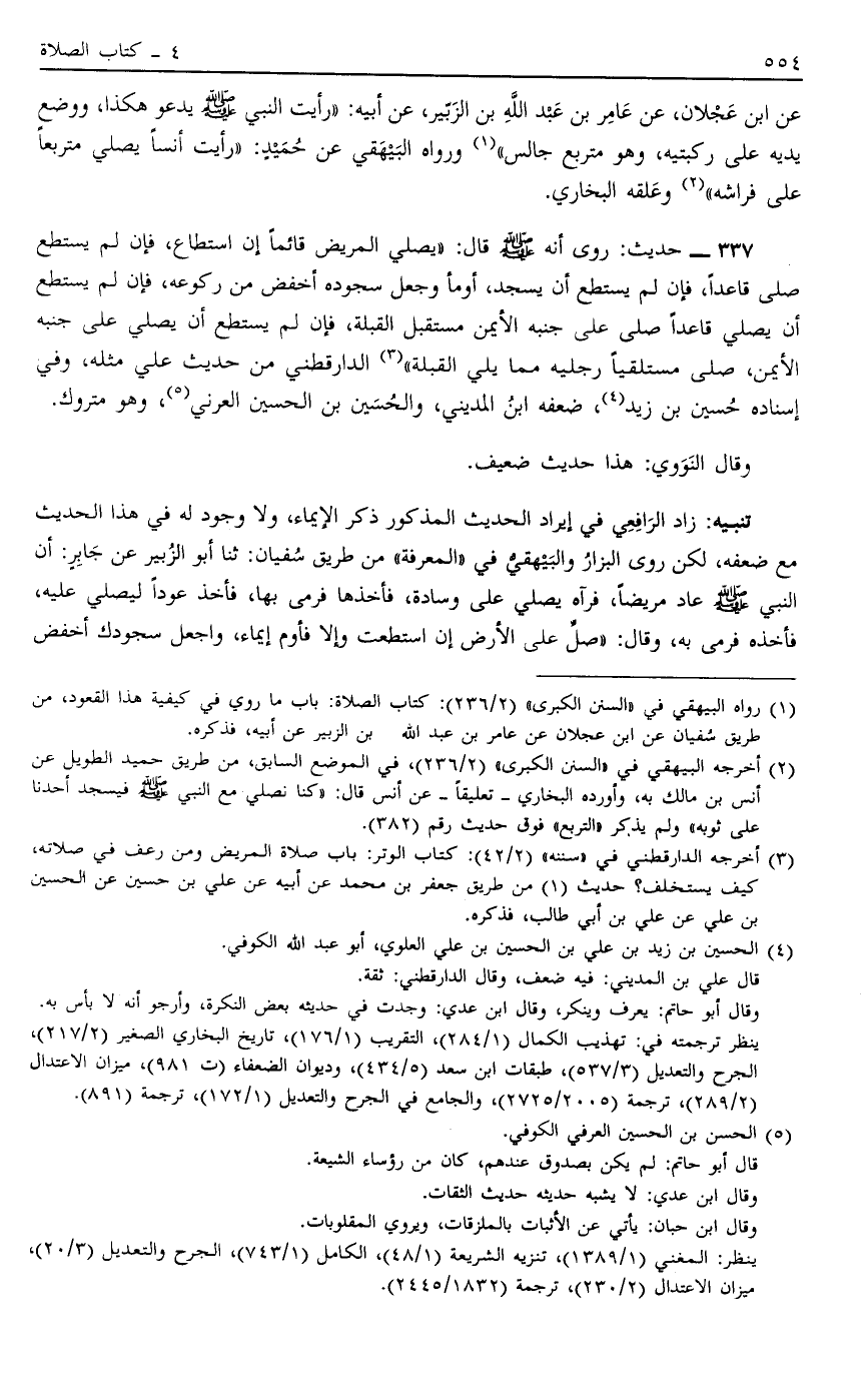 337 - حَدِيثُ رُوِيَ أَنَّهُ صَلَّى اللَّهُ عَلَيْهِ وَسَلَّمَ قَالَ: "يُصَلِّي الْمَرِيضُ قَائِمًا إنْ اسْتَطَاعَ فَإِنْ لَمْ يَسْتَطِعْ صَلَّى قَاعِدًا فَإِنْ لَمْ يَسْتَطِعْ أَنْ يَسْجُدَ أَوْمَأَ وَجَعَلَ سُجُودَهُ أَخْفَضَ مِنْ رُكُوعِهِ فَإِنْ لَمْ يَسْتَطِعْ أَنْ يُصَلِّيَ قَاعِدًا صَلَّى عَلَى جَنْبِهِ الْأَيْمَنِ مُسْتَقْبِلَ الْقِبْلَةِ فَإِنْ لَمْ يَسْتَطِعْ أَنْ يُصَلِّيَ عَلَى جَنْبِهِ الْأَيْمَنِ صَلَّى مُسْتَلْقِيًا رِجْلَيْهِ مِمَّا يَلِي الْقِبْلَةَ" 3 الدَّارَقُطْنِيُّ مِنْ حَدِيثِ عَلِيٍّ مِثْلُهُ وَفِي إسْنَادِهِ حُسَيْنُ بْنُ زَيْدٍ4 ضَعَّفَهُ ابْنُ الْمَدِينِيِّ وَالْحَسَنُ بْنُ الْحُسَيْنِ الْعُرَنِيُّ5 وَهُوَ مَتْرُوكٌ
