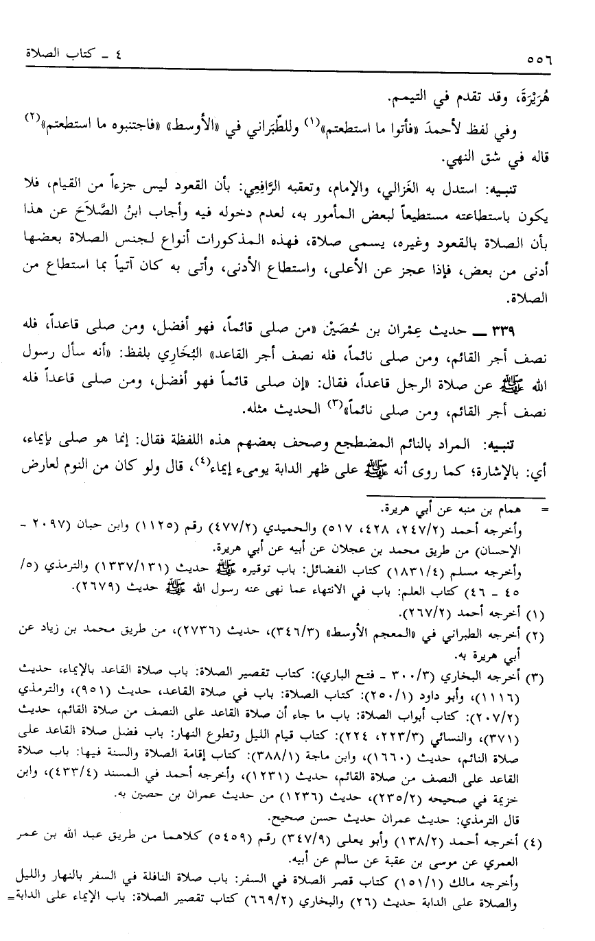 339 - حَدِيثُ عِمْرَانَ بْنِ حُصَيْنٍ: "مَنْ صَلَّى قَائِمًا فَهُوَ أَفَضْلُ وَمَنْ صَلَّى قَاعِدًا فَلَهُ نِصْفُ أَجْرِ الْقَائِمِ وَمَنْ صَلَّى نَائِمًا فَلَهُ نِصْفُ أَجْرِ الْقَاعِدِ" الْبُخَارِيُّ بِلَفْظِ: أَنَّهُ سَأَلَ رَسُولَ اللَّهِ صَلَّى اللَّهُ عَلَيْهِ وَسَلَّمَ عَنْ صَلَاةِ الرَّجُلِ قَاعِدًا فَقَالَ: "إنْ صَلَّى قَائِمًا فَهُوَ أَفْضَلُ وَمَنْ صَلَّى قَاعِدًا فَلَهُ نِصْفُ أَجْرِ الْقَائِمِ وَمَنْ صَلَّى نَائِمًا" 3 الْحَدِيثُ مِثْلُهُ