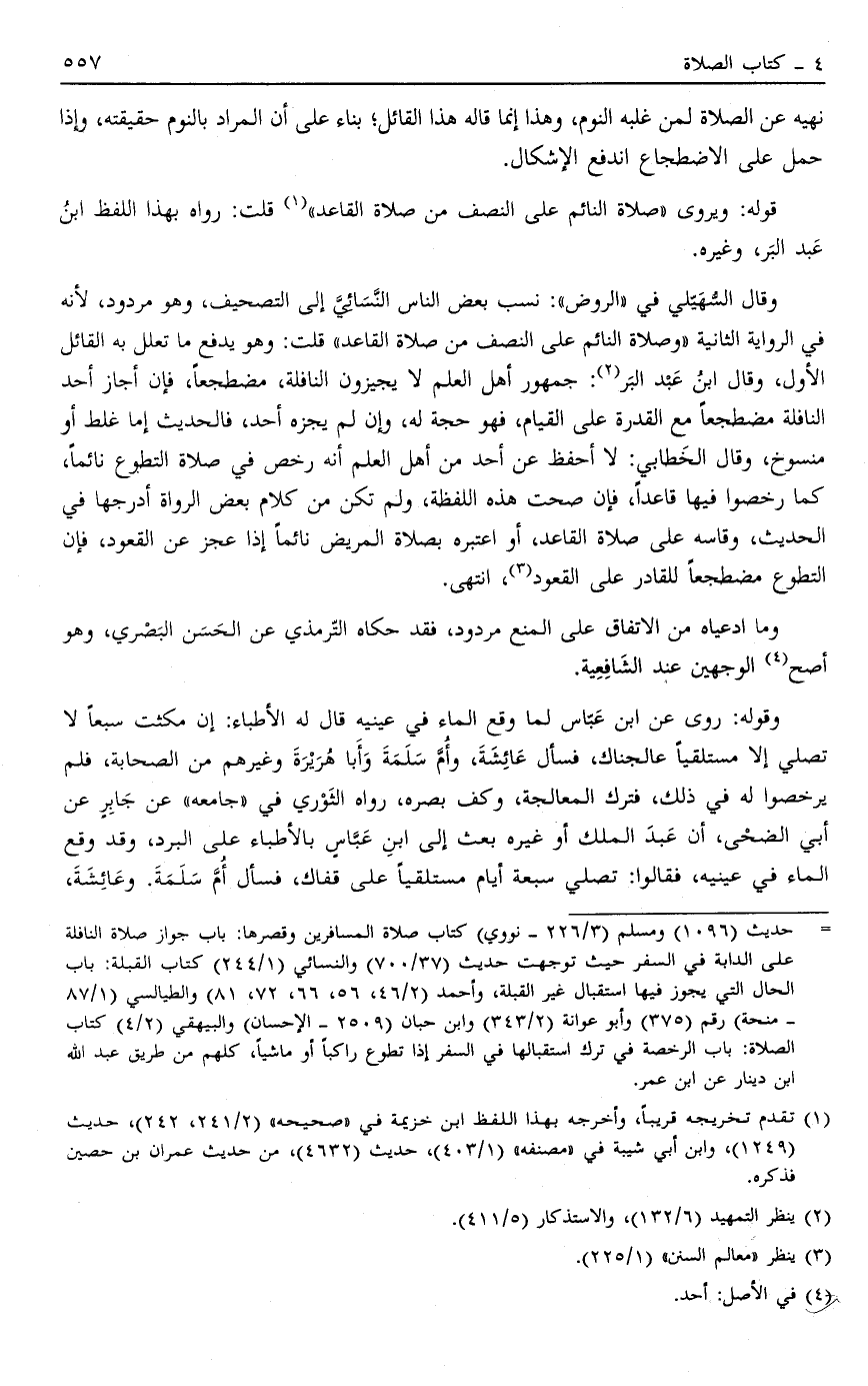 وَقَالَ السُّهَيْلِيُّ فِي الرَّوْضِ نَسَبَ بَعْضُ النَّاسِ النَّسَائِيَّ إلَى التَّصْحِيفِ وهو مردود لأنه في الرواية الثانية وَصَلَاةُ النَّائِمِ عَلَى النِّصْفِ مِنْ صَلَاةِ الْقَاعِدِ قُلْتُ وَهُوَ يَدْفَعُ مَا تَعَلَّلَ بِهِ الْقَائِلُ الْأَوَّلُ وَقَالَ ابْنُ عَبْدِ الْبَرِّ2 جُمْهُورُ أَهْلِ الْعِلْمِ لَا يُجِيزُونَ النَّافِلَةَ مُضْطَجِعًا فَإِنْ أَجَازَ أَحَدٌ النَّافِلَةَ مُضْطَجِعًا مَعَ الْقُدْرَةِ عَلَى الْقِيَامِ فَهُوَ حُجَّةٌ لَهُ وَإِنْ لَمْ يُجِزْهُ أَحَدٌ فَالْحَدِيثُ إمَّا غَلَطٌ أَوْ مَنْسُوخٌ وَقَالَ الْخَطَّابِيُّ لَا أَحْفَظُ عَنْ أَحَدٍ مِنْ أَهْلِ الْعِلْمِ أَنَّهُ رَخَّصَ فِي صَلَاةِ التَّطَوُّعِ نَائِمًا كَمَا رَخَّصُوا فِيهَا قَاعِدًا فَإِنْ صَحَتْ هَذِهِ اللَّفْظَةُ وَلَمْ تَكُنْ مِنْ كَلَامِ بَعْضِ الرُّوَاةِ أَدْرَجَهَا فِي الْحَدِيثِ وَقَاسَهُ عَلَى صَلَاةِ الْقَاعِدِ أَوْ اعْتَبَرَهُ بِصَلَاةِ الْمَرِيضِ نَائِمًا إذَا عَجَزَ عَنْ الْقُعُودِ فَإِنَّ التَّطَوُّعَ مُضْطَجِعًا لِلْقَادِرِ عَلَى الْقُعُودِ3 انْتَهَى