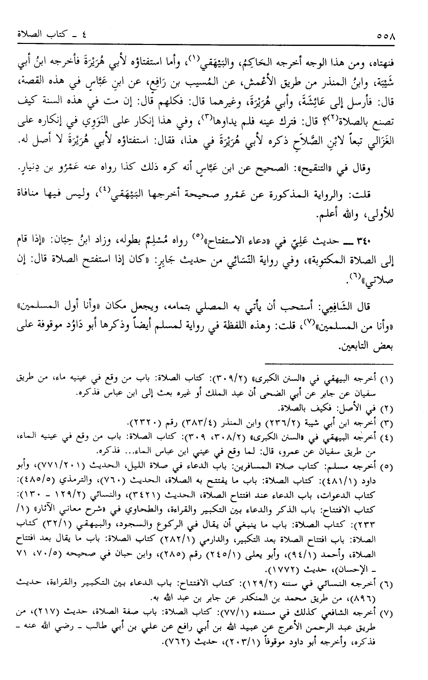 340 - حَدِيثُ عَلِيٍّ فِي دُعَاءِ الِاسْتِفْتَاحِ5 رَوَاهُ مُسْلِمٌ بِطُولِهِ وَزَادَ ابْنُ حِبَّانَ إذَا قَامَ إلَى الصَّلَاةِ الْمَكْتُوبَةِ وَفِي رِوَايَةِ النَّسَائِيّ مِنْ حَدِيثِ جَابِرٍ كَانَ إذَا اسْتَفْتَحَ الصَّلَاةَ قَالَ: "إنَّ صَلَاتِي ... " 6