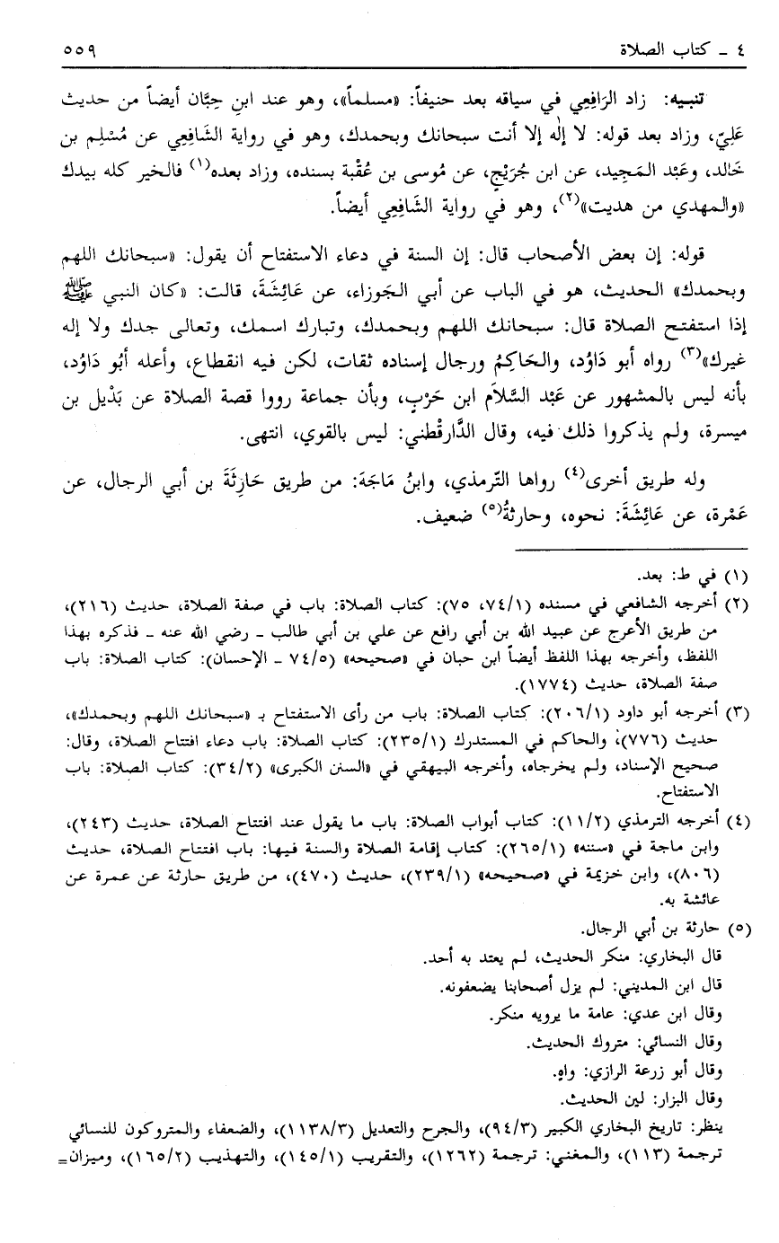 4 أخرجه الترمذي "2/11": كتاب أبواب الصلاة: باب ما يقول عند افتتاح الصلاة، حديث "243"، وابن ماجة في "سننه" "1/265": كتاب إقامة الصلاة والسنة فيها: باب افتتاح الصلاة، حديث "806"، وابن خزيمة في "صحيحه" "1/239"، حديث "470"، من طريق حارثة عن عمرة عن عائشة به.