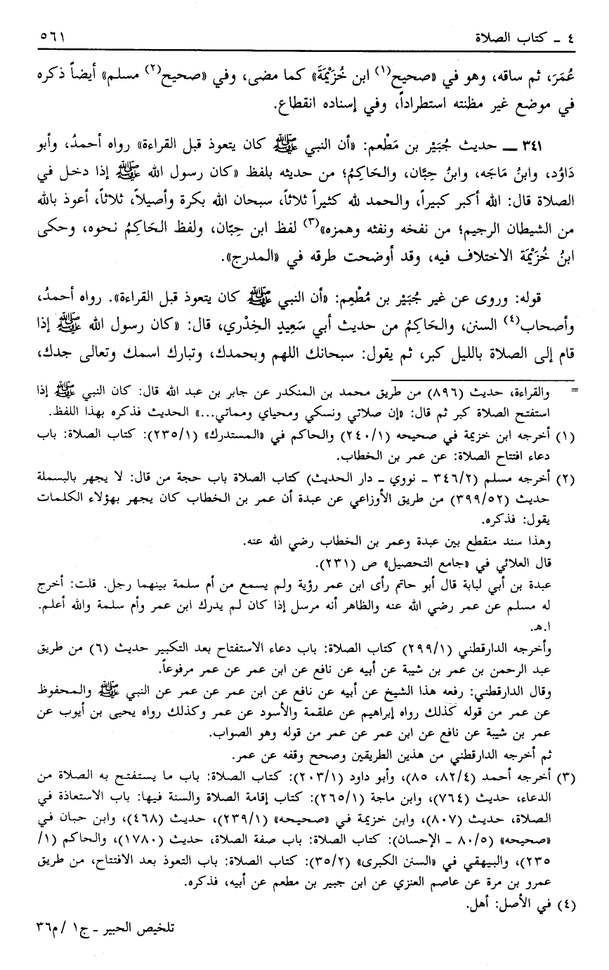 341 - حَدِيثُ جُبَيْرِ بْنِ مُطْعَمٍ: أَنَّ النَّبِيِّ صَلَّى اللَّهُ عَلَيْهِ وَسَلَّمَ كَانَ يَتَعَوَّذُ قَبْلَ الْقِرَاءَةِ رَوَاهُ أَحْمَدُ وَأَبُو دَاوُد وَابْنُ مَاجَهْ وَابْنُ حِبَّانَ وَالْحَاكِمُ مِنْ حَدِيثِهِ بِلَفْظِ: كَانَ رَسُولُ اللَّهِ صَلَّى اللَّهُ عَلَيْهِ وَسَلَّمَ إذَا دَخَلَ فِي الصَّلَاةِ قَالَ: "اللَّهُ أَكْبَرُ كَبِيرًا وَالْحَمْدُ لِلَّهِ كَثِيرًا"- ثَلَاثًا "سُبْحَانَ اللَّهِ بُكْرَةً وَأَصِيلًا"- ثَلَاثًا "أَعُوذُ بِاَللَّهِ مِنْ الشَّيْطَانِ الرَّجِيمِ مِنْ نَفْخِهِ وَنَفْثِهِ وَهَمْزِهِ" 3 لَفْظُ ابْنِ حِبَّانَ وَلَفْظُ الْحَاكِمِ نَحْوُهُ وَحَكَى ابْنُ خُزَيْمَةَ الِاخْتِلَافَ فِيهِ وَقَدْ أَوْضَحْتُ طُرُقَهُ فِي الْمُدْرَجِ