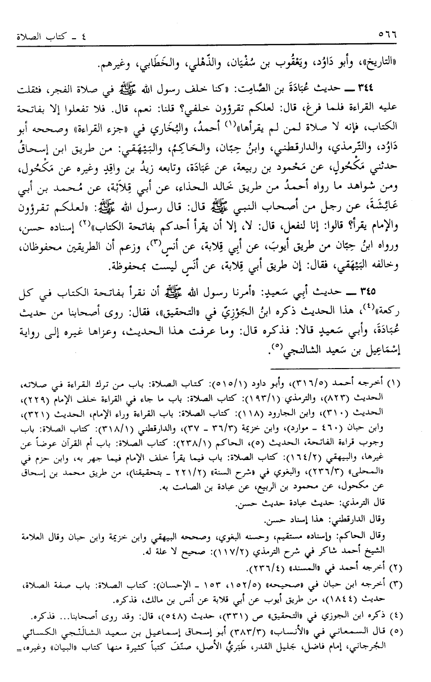 344 - حَدِيثُ عُبَادَةَ بْنِ الصَّامِتِ: كُنَّا خَلْفَ رَسُولِ اللَّهِ صَلَّى اللَّهُ عَلَيْهِ وَسَلَّمَ فِي صَلَاةِ الْفَجْرِ فَثَقُلَتْ عَلَيْهِ الْقِرَاءَةُ فَلَمَّا فَرَغَ قَالَ: "لَعَلَّكُمْ تَقْرَءُونَ خَلْفِي؟ " قُلْنَا: نَعَمْ, قَالَ: "فَلَا تَفْعَلُوا إلَّا بِفَاتِحَةِ الْكِتَابِ فَإِنَّهُ لَا صَلَاةَ لِمَنْ لَمْ يَقْرَأْهَا" 1 أَحْمَدُ وَالْبُخَارِيُّ فِي جُزْءِ الْقِرَاءَةِ وَصَحَّحَهُ أَبُو دَاوُد وَالتِّرْمِذِيُّ وَالدَّارَقُطْنِيّ وَابْنُ حِبَّانَ وَالْحَاكِمُ وَالْبَيْهَقِيُّ مِنْ طَرِيقِ ابْنِ إِسْحَاقَ حَدَّثَنِي مَكْحُولٌ عَنْ مَحْمُودِ بْنِ رَبِيعَةَ عَنْ عُبَادَةَ وَتَابَعَهُ زَيْدُ بْنُ وَاقِدٍ وَغَيْرُهُ عَنْ مَكْحُولٍ وَمِنْ شَوَاهِدِهِ مَا رَوَاهُ أَحْمَدُ مِنْ طَرِيقِ خَالِدٍ الْحَذَّاءِ عَنْ أَبِي قِلَابَةَ عَنْ مُحَمَّدِ بْنِ أَبِي عَائِشَةَ عَنْ رَجُلٍ مِنْ أَصْحَابِ النَّبِيِّ صَلَّى اللَّهُ عَلَيْهِ وَسَلَّمَ قَالَ: قَالَ رَسُولُ اللَّهِ صَلَّى اللَّهُ عَلَيْهِ وَسَلَّمَ: "لَعَلَّكُمْ تَقْرَءُونَ وَالْإِمَامُ يَقْرَأُ؟ " قَالُوا: إنَّا لَنَفْعَلُ, قَالَ: "لَا إلَّا أَنْ يَقْرَأَ أَحَدُكُمْ بِفَاتِحَةِ الْكِتَابِ" 2 إسْنَادُهُ حَسَنٌ وَرَوَاهُ ابْنُ حِبَّانَ مِنْ طَرِيقِ أَيُّوبَ عَنْ أَبِي قِلَابَةَ عَنْ أَنَسٍ3 وَزَعَمَ أَنَّ الطَّرِيقَيْنِ مَحْفُوظَانِ وَخَالَفَهُ الْبَيْهَقِيّ فَقَالَ إنَّ طَرِيقَ أَبِي قِلَابَةَ عَنْ أَنَسٍ لَيْسَتْ بِمَحْفُوظَةٍ