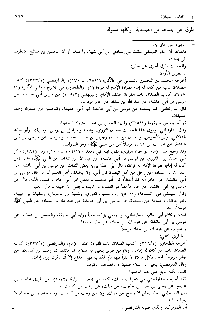 وقد رجح هذا الإمام أبو حاتم الرازي، فقال ابنه في "العلل " "1/104- 105"، رقم "282": ذكر أبي حديثاً رواه الثوري عن موسى بن أبي عائشة، عن عبد الله بن شداد، عن النبي صَلَّى اللَّهُ عَلَيْهِ وَسَلَّمَ، قال: "من كان له إمام، فقراءة الإمام له قراءة"، قال أبي: هذا يرويه بعض الثقات عن موسى بن أبي عائشة، عن عبد اللَّه بن شداد، عن رجل من أهل البصرة قال أبي: ولا يختلف أهل العلم أن من قال موسى بن أبي عائشة، عن جابر أنه قد أخطأ، قال أبو محمد- يعني ابن أبي حاتم- قلت: الذي قال عن موسى بن أبي عائشة، عن جابر فأخطأ هو النعمان بن ثابت- يعني أبا حنيفة- قال: نعم.