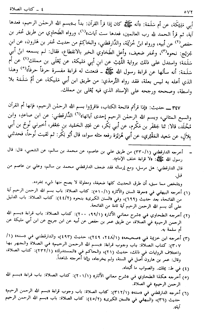 أَبِي مُلَيْكَةَ عَنْ أُمِّ سَلَمَةَ أَنَّهُ صَلَّى اللَّهُ عَلَيْهِ وَسَلَّمَ كان إذا قرأ القرآن بدأ بـ"بسم اللَّهِ الرَّحْمَنِ الرَّحِيمِ فَعَدَّهَا آيَةً ثُمَّ قَرَأَ الْحَمْدُ لِلَّهِ رَبِّ الْعَالَمِينَ فَعَدَّهَا سِتَّ آيَاتٍ"1 وَرَوَاهُ الطَّحَاوِيُّ مِنْ طَرِيق عُمَرَ بْنِ حَفْصٍ2 عَنْ أَبِيهِ وَرَوَاهُ ابْنُ خُزَيْمَةَ وَالدَّارَقُطْنِيّ وَالْحَاكِمُ مِنْ حَدِيث عُمَرَ بْنِ هَارُونَ عَنْ ابْنِ جُرَيْجٍ نَحْوَهُ3 وَعُمَرُ ضَعِيفٌ وَأَعَلَّ الطَّحَاوِيُّ الْخَبَرَ بِالِانْقِطَاعِ فَقَالَ لَمْ يَسْمَعْهُ ابْنُ أَبِي مُلَيْكَةَ مِنْ أُمِّ سَلَمَةَ واستدل على ذلك برواية اللَّيْثِ عَنْ ابْنِ أَبِي مُلَيْكَةَ عَنْ يَعْلَى بْنِ يملك4 عَنْ أُمِّ سَلَمَةَ أَنَّهُ سَأَلَهَا عَنْ قِرَاءَةِ رَسُولِ اللَّهِ صَلَّى اللَّهُ عَلَيْهِ وَسَلَّمَ فَنَعَتَتْ لَهُ قِرَاءَةً مُفَسَّرَةً حَرْفًا حَرْفًا5 وَهَذَا الَّذِي أَعَلَّهُ بِهِ لَيْسَ بِعِلَّةٍ فَقَدْ رَوَاهُ التِّرْمِذِيُّ مِنْ طَرِيق ابْنِ أَبِي مُلَيْكَةَ عَنْ أُمِّ سَلَمَةَ بلا وساطة وَصَحَّحَهُ وَرَجَّحَهُ عَلَى الْإِسْنَادِ الذي فيه بعلي بن يملك