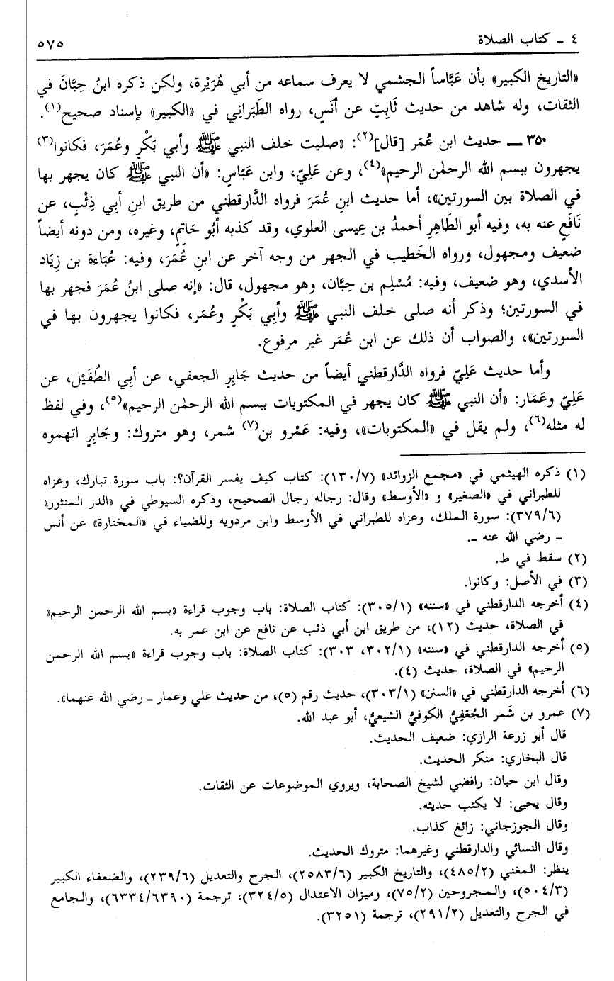 350 - حَدِيثُ ابْنِ عمر [قال:] 2 صَلَّيْتُ خَلْفَ النَّبِيِّ صَلَّى اللَّهُ عَلَيْهِ وَسَلَّمَ وَأَبِي بَكْرٍ وَعُمَرَ فَكَانُوا3 يَجْهَرُونَ بِبِسْمِ اللَّهِ الرَّحْمَنِ الرَّحِيمِ4 وَعَنْ عَلِيٍّ وَابْنِ عَبَّاسٍ أَنَّ النَّبِيَّ صَلَّى اللَّهُ عَلَيْهِ وَسَلَّمَ كَانَ يَجْهَرُ بِهَا فِي الصَّلَاةِ بَيْنِ السُّورَتَيْنِ أَمَّا حَدِيثُ ابْنِ عُمَرَ فَرَوَاهُ الدَّارَقُطْنِيُّ مِنْ طَرِيقِ ابْنِ أَبِي ذِئْبٍ عَنْ نَافِعٍ عَنْهُ بِهِ وَفِيهِ أَبُو الطَّاهِرِ أَحْمَدُ بْنُ عِيسَى الْعَلَوِيِّ وَقَدْ كَذَّبَهُ أَبُو حَاتِمٍ وَغَيْرُهُ وَمَنْ دُونَهُ أَيْضًا ضَعِيفٌ وَمَجْهُولٌ وَرَوَاهُ الْخَطِيبُ فِي الْجَهْرِ مِنْ وَجْهٍ آخِرَ عَنْ ابْنِ عُمَرَ وَفِيهِ عباءة بْنُ زِيَادٍ الْأَسَدِيُّ وَهُوَ ضَعِيفٌ وَفِيهِ مُسْلِمُ بْنُ حِبَّانَ وَهُوَ مَجْهُولٌ قَالَ إنَّهُ صَلَّى ابْنُ عُمَرَ فَجَهَرَ بِهَا فِي السُّورَتَيْنِ وَذَكَرَ أَنَّهُ صَلَّى خَلْفَ النَّبِيِّ صَلَّى اللَّهُ عَلَيْهِ وَسَلَّمَ وَأَبِي بَكْرٍ وَعُمَرَ فَكَانُوا يَجْهَرُونَ بِهَا فِي السُّورَتَيْنِ وَالصَّوَابُ أَنَّ ذَلِكَ عَنْ ابْنِ عُمَرَ غَيْرُ مَرْفُوعٍ