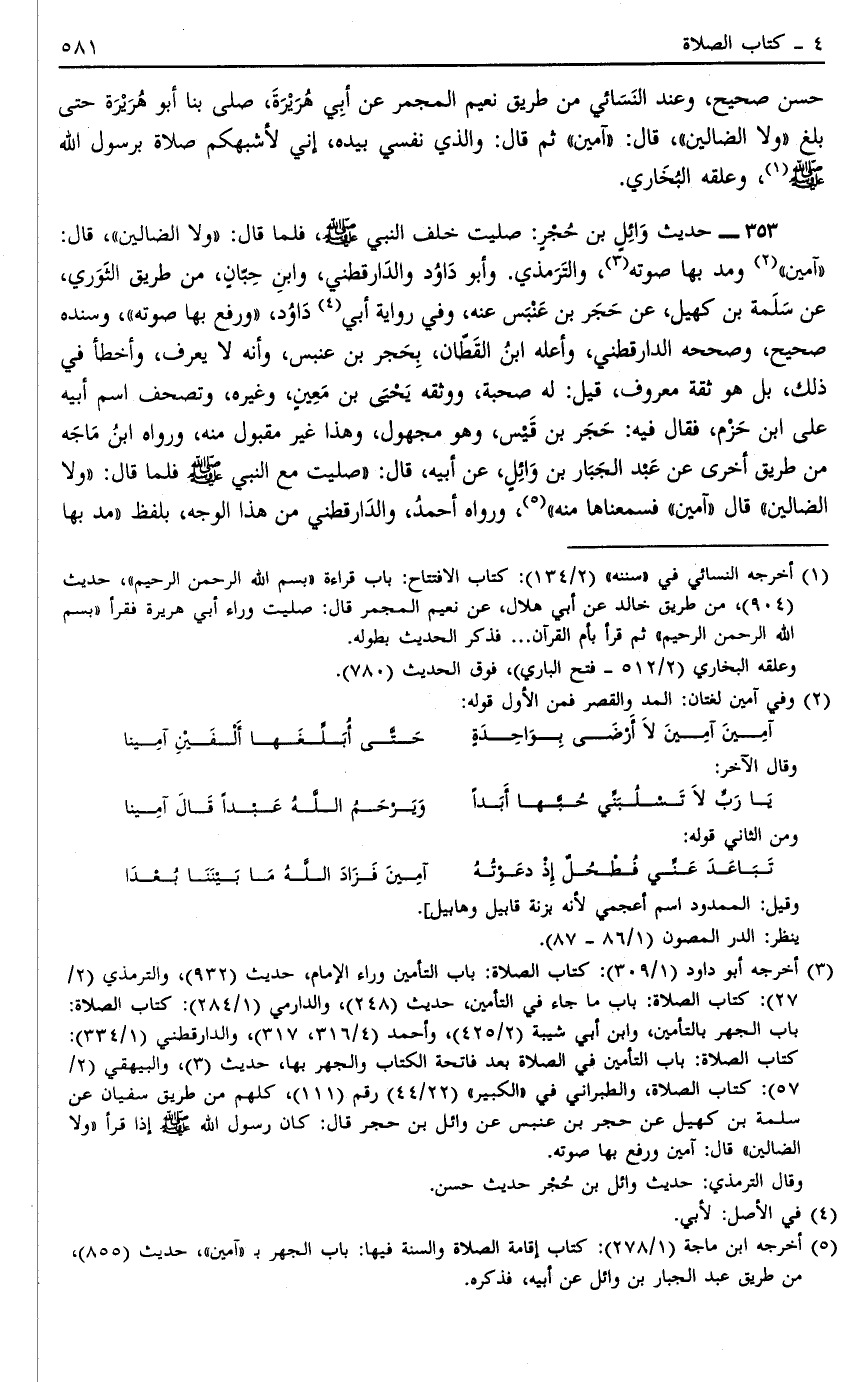 353 - حَدِيثُ وَائِلِ بْنِ حُجْرٍ صَلَّيْتُ خَلْفَ النَّبِيِّ صَلَّى اللَّهُ عَلَيْهِ وَسَلَّمَ فَلَمَّا قَالَ: {وَلَا الضَّالِّينَ} قَالَ: "آمِينَ" 2 وَمَدَّ بِهَا صَوْتَهُ3 التِّرْمِذِيُّ وَأَبُو دَاوُد وَالدَّارَقُطْنِيّ وَابْنُ حِبَّانَ مِنْ طَرِيق الثَّوْرِيِّ عَنْ سَلَمَةَ بْنِ كُهَيْلٍ عَنْ حُجْرِ بْنِ عَنْبَسٍ عَنْهُ وَفِي رِوَايَةِ أَبِي4 دَاوُد وَرَفَعَ بِهَا صَوْتَهُ وَسَنَدُهُ صحيح وصححه الدَّارَقُطْنِيُّ وَأَعَلَّهُ ابْنُ الْقَطَّانِ بِحُجْرِ بْنِ عَنْبَسٍ وَأَنَّهُ لَا يُعْرَفُ وَأَخْطَأَ فِي ذَلِكَ بَلْ هُوَ ثِقَةٌ مَعْرُوفٌ قِيلَ لَهُ صُحْبَةٌ وَوَثَّقَهُ يَحْيَى بْنُ مَعِينٍ وَغَيْرُهُ وَتُصُحِّفَ اسْمُ أَبِيهِ عَلَى ابْنِ حَزْمٍ فَقَالَ فِيهِ حُجْرُ بْنُ قَيْسٍ وَهُوَ مَجْهُولٌ وَهَذَا غَيْرُ مَقْبُولٍ مِنْهُ وَرَوَاهُ ابْنُ مَاجَهْ مِنْ طَرِيقٍ أُخْرَى عَنْ عَبْدِ الْجَبَّارِ بْنِ وَائِلٍ عَنْ أَبِيهِ قَالَ: صَلَّيْتُ مَعَ النَّبِيِّ صَلَّى اللَّهُ عَلَيْهِ وَسَلَّمَ فَلَمَّا قَالَ: {وَلَا الضَّالِّينَ} قَالَ: "آمِينَ". فَسَمِعْنَاهَا مِنْهُ5 وَرَوَاهُ أَحْمَدُ وَالدَّارَقُطْنِيّ مِنْ هَذَا الْوَجْهِ بِلَفْظِ: مَدَّ بِهَا
