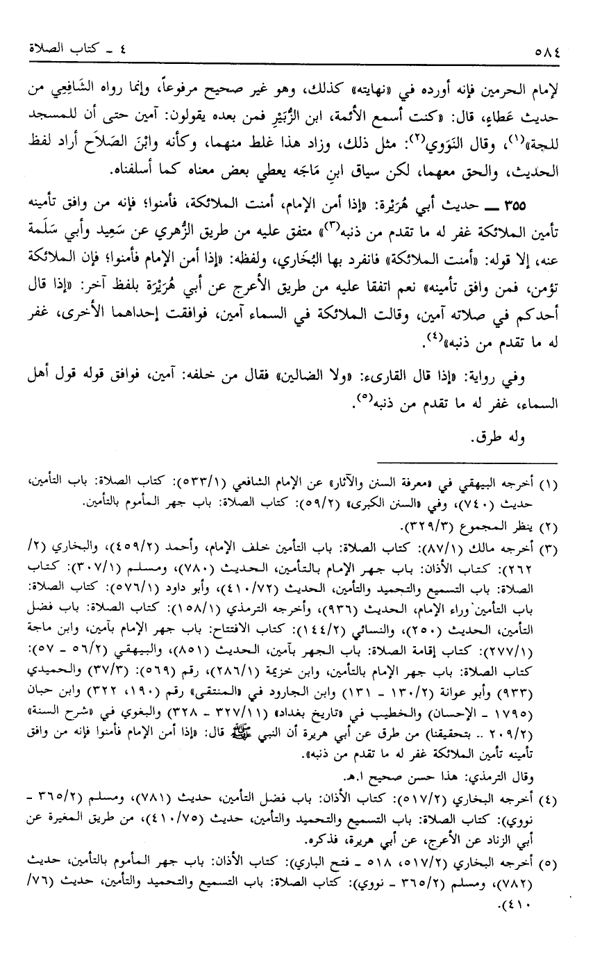 355 - حَدِيثُ أَبِي هُرَيْرَةَ: "إذَا أَمَّنَ الْإِمَامُ أَمَّنَتْ الْمَلَائِكَةُ فَأَمِّنُوا فَإِنَّهُ مَنْ وَافَقَ تَأْمِينُهُ تَأْمِينَ الْمَلَائِكَةِ غُفِرَ لَهُ مَا تَقَدَّمَ مِنْ ذَنْبِهِ" 3 مُتَّفَقٌ عَلَيْهِ مِنْ طَرِيقِ الزُّهْرِيِّ عَنْ سَعِيدٍ وَأَبِي سَلَمَةَ عَنْهُ إلَّا قَوْلَهُ: "أَمَّنَتْ الْمَلَائِكَةُ" فَانْفَرَدَ بِهَا الْبُخَارِيُّ وَلَفْظُهُ: "إذَا أَمَّنَ الْإِمَامُ فَأَمِّنُوا فَإِنَّ الْمَلَائِكَةَ تُؤَمِّنُ فَمَنْ وَافَقَ تَأْمِينُهُ" نَعَمْ اتَّفَقَا عَلَيْهِ مِنْ طَرِيقِ الْأَعْرَجِ عَنْ أَبِي هُرَيْرَةَ بِلَفْظٍ آخَر: "إذَا قَالَ أَحَدُكُمْ فِي صَلَاتِهِ آمِينَ وَقَالَتْ الْمَلَائِكَةُ فِي السَّمَاءِ آمِينَ فَوَافَقَتْ إحْدَاهُمَا الْأُخْرَى غُفِرَ لَهُ مَا تَقَدَّمَ مِنْ ذَنْبِهِ" 4
