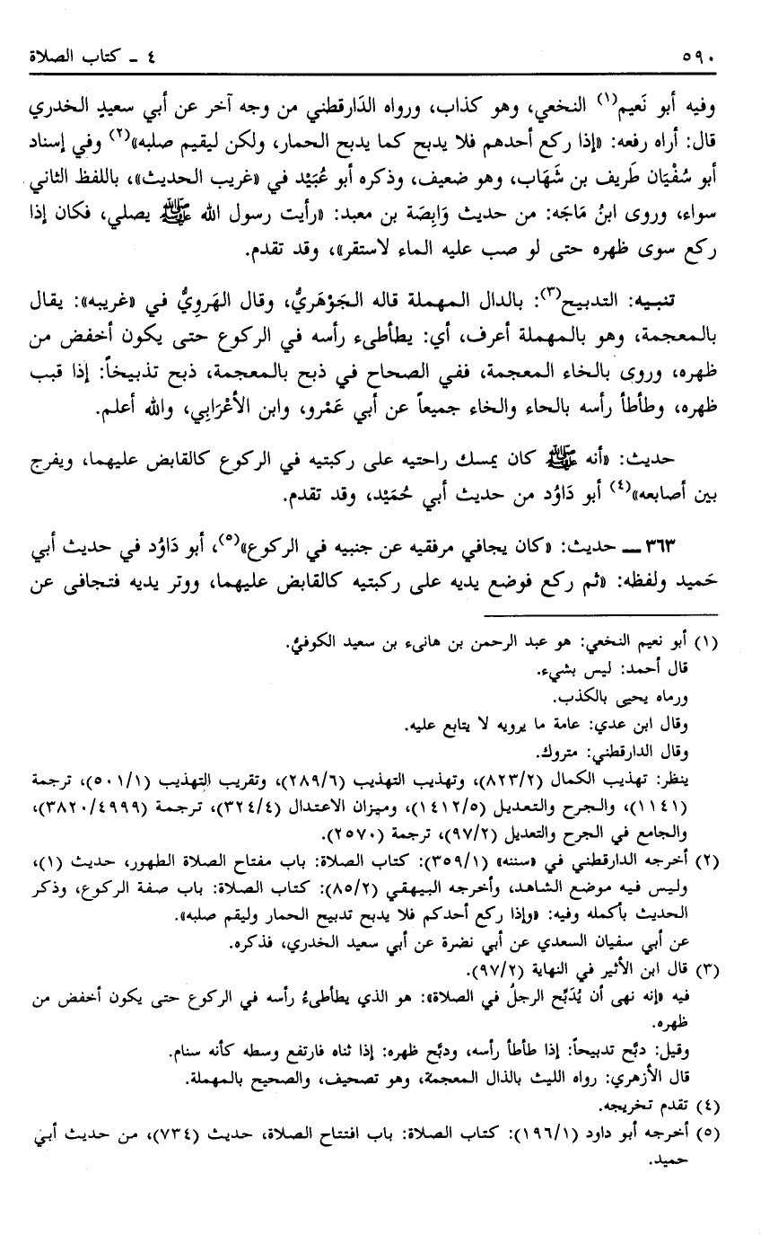 وَفِيهِ أَبُو نُعَيْمٍ1 النَّخَعِيُّ وَهُوَ كَذَّابٌ وَرَوَاهُ الدَّارَقُطْنِيُّ مِنْ وَجْهٍ آخَرَ عَنْ أَبِي سَعِيدٍ الْخُدْرِيِّ قَالَ أَرَاهُ رَفَعَهُ: "إذَا رَكَعَ أَحَدُكُمْ فَلَا يُذَبِّحْ كَمَا يُذَبِّحُ الْحِمَارُ وَلَكِنْ لِيُقِيمَ صُلْبَهُ" 2 وَفِي إسْنَادِهِ أَبُو سُفْيَانَ طَرِيفُ بْنُ شِهَابٍ وَهُوَ ضعيف وذكره أبو عبيد فِي غَرِيبِ الْحَدِيثِ بِاللَّفْظِ الثَّانِي سَوَاءً وَرَوَى ابْنُ مَاجَهْ مِنْ حَدِيثِ وَابِصَةَ بْنِ مَعْبَدٍ رَأَيْتُ رَسُولَ اللَّهِ صَلَّى اللَّهُ عَلَيْهِ وَسَلَّمَ يُصَلِّي فَكَانَ إذَا رَكَعَ سَوَّى ظَهْرَهُ حَتَّى لَوْ صُبَّ عَلَيْهِ الْمَاءُ لَاسْتَقَرَّ وَقَدْ تَقَدَّمَ.