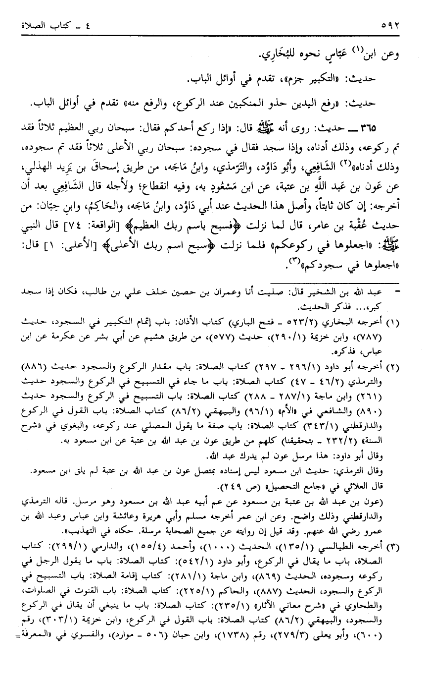 365 - حَدِيثُ: رُوِيَ أَنَّهُ صَلَّى اللَّهُ عَلَيْهِ وَسَلَّمَ قَالَ: "إذَا رَكَعَ أَحَدُكُمْ فَقَالَ: سُبْحَانَ رَبِّي الْعَظِيمِ ثَلَاثًا فَقَدْ تَمَّ رُكُوعُهُ وَذَلِكَ أَدْنَاهُ وَإِذَا سَجَدَ فَقَالَ فِي سُجُودِهِ: سُبْحَانَ رَبِّي الْأَعْلَى ثَلَاثًا فَقَدْ تَمَّ سُجُودُهُ وَذَلِكَ أَدْنَاهُ" 2 الشَّافِعِيُّ وَأَبُو دَاوُد وَالتِّرْمِذِيُّ وَابْنُ مَاجَهْ مِنْ طَرِيقِ إِسْحَاقَ بْنِ يَزِيدَ الْهُذَلِيِّ عَنْ عَوْنِ بْنِ عَبْدِ اللَّهِ بْنِ عُتْبَةَ عَنْ ابْنِ مَسْعُودٍ بِهِ وَفِيهِ انْقِطَاعٌ وَلِأَجْلِهِ قَالَ الشَّافِعِيُّ بَعْدَ أَنْ أَخَرَجَهُ إنْ كَانَ ثَابِتًا وَأَصْلُ هَذَا الْحَدِيثِ عِنْدَ أَبِي دَاوُد وَابْنِ مَاجَهْ وَالْحَاكِمِ وَابْنِ حِبَّانَ مِنْ حَدِيثِ عُقْبَةَ بْنِ عَامِرٍ قَالَ لَمَّا نَزَلَتْ: {فَسَبِّحْ بِاسْمِ رَبِّكَ الْعَظِيمِ} [الواقعة: 74] قَالَ النَّبِيُّ صَلَّى اللَّهُ عَلَيْهِ وَسَلَّمَ: "اجْعَلُوهَا فِي رُكُوعِكُمْ" فَلَمَّا نَزَلَتْ: {سَبِّحْ اسْمَ رَبِّكَ الْأَعْلَى} [الْأَعْلَى: 1] قَالَ: "اجْعَلُوهَا فِي سُجُودِكُمْ" 3