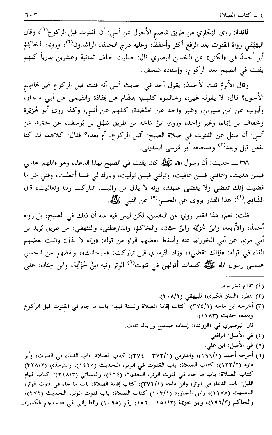 371 - حَدِيثُ: أَنَّ رَسُولَ اللَّهِ صَلَّى اللَّهُ عَلَيْهِ وَسَلَّمَ كَانَ يَقْنُتُ فِي الصُّبْحِ بِهَذَا الدُّعَاءِ وَهُوَ "اللَّهُمَّ اهْدِنِي فِيمَنْ هَدَيْتَ وَعَافِنِي فِيمَنْ عَافَيْت وَتَوَلَّنِي فِيمَنْ تَوَلَّيْتَ وَبَارِكْ لِي فِيمَا أَعْطَيْتَ وَقِنِي شَرَّ مَا قَضَيْتَ إنَّك تَقْضِي وَلَا يُقْضَى عَلَيْكَ وَإِنَّهُ لَا يَذِلُّ مَنْ وَالَيْتَ تَبَارَكْتَ رَبَّنَا وَتَعَالَيْت" قَالَ الشَّافِعِيُّ4 هَذَا الْقَدْرُ يُرْوَى عَنْ الْحَسَنِ5 عَنْ النَّبِيِّ صَلَّى اللَّهُ عَلَيْهِ وَسَلَّمَ