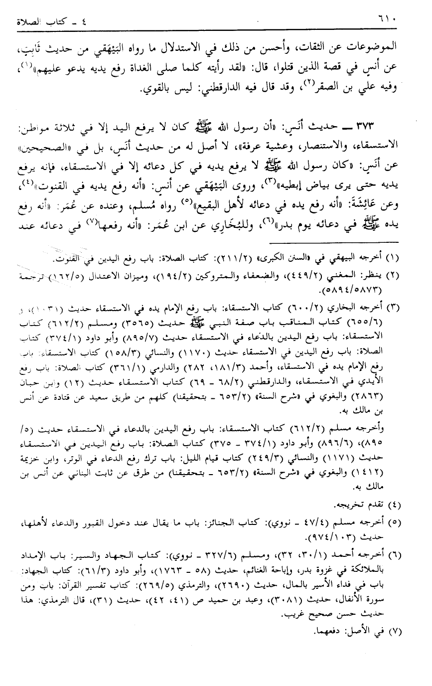 373 - حَدِيثُ أَنَسٍ: أَنَّ رَسُولَ اللَّهِ صَلَّى اللَّهُ عَلَيْهِ وَسَلَّمَ كَانَ لَا يَرْفَعُ الْيَدَ إلَّا فِي ثَلَاثَةِ مَوَاطِنَ الِاسْتِسْقَاءِ وَالِاسْتِنْصَارِ وَعَشِيَّةَ عَرَفَةَ. لَا أَصْلَ لَهُ مِنْ حَدِيثِ أَنَسٍ بَلْ فِي الصَّحِيحَيْنِ عَنْ أَنَسٍ كَانَ رَسُولُ اللَّهِ صَلَّى اللَّهُ عَلَيْهِ وَسَلَّمَ لَا يَرْفَعُ يَدَيْهِ فِي كُلِّ دُعَائِهِ إلَّا فِي الِاسْتِسْقَاءِ فَإِنَّهُ يَرْفَعُ يَدَيْهِ حَتَّى يُرَى بَيَاضُ إبْطَيْهِ3 وَرَوَى الْبَيْهَقِيُّ عَنْ أَنَسٍ أَنَّهُ رَفَعَ يَدَيْهِ فِي الْقُنُوتِ4 وَعَنْ عَائِشَةَ أَنَّهُ رَفَعَ يَدَهُ فِي دُعَائِهِ لِأَهْلِ الْبَقِيعِ5 رَوَاهُ مُسْلِمٌ وَعِنْدَهُ عَنْ عُمَرَ أَنَّهُ رَفَعَ يَدَهُ صَلَّى اللَّهُ عَلَيْهِ وَسَلَّمَ فِي دُعَائِهِ يَوْمَ بَدْرٍ6 وَلِلْبُخَارِيِّ عَنْ بن عمر أنه رفعها7 فِي دُعَائِهِ عِنْدَ