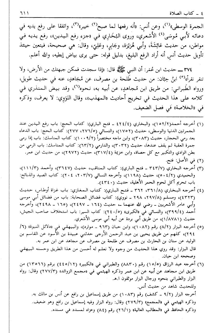 374 - حَدِيثُ ابْنِ عُمَرَ أَنَّ النَّبِيَّ صَلَّى اللَّهُ عَلَيْهِ وَسَلَّمَ قَالَ: "إذَا سَجَدْتَ فَمَكِّنْ جَبْهَتَك مِنْ الْأَرْضِ وَلَا تَنْقُرْ نَقْرًا" 5 ابْنُ حِبَّانَ مِنْ حَدِيثِ طَلْحَةَ بْنِ مُصَرَّفٍ عَنْ مُجَاهَدٍ عَنْهُ فِي حَدِيثٍ طَوِيلٍ وَرَوَاهُ الطَّبَرَانِيُّ: مِنْ طَرِيقِ ابْنِ مُجَاهَدٍ عَنْ أَبِيهِ بِهِ نَحْوُهُ6 وَقَدْ بَيَّضَ الْمُنْذِرِيُّ فِي كَلَامِهِ عَلَى هَذَا الْحَدِيثِ فِي تَخْرِيجِ أَحَادِيثِ الْمُهَذَّبِ وَقَالَ النَّوَوِيُّ: لَا يُعْرَفُ وَذَكَرَهُ فِي الْخُلَاصَةِ فِي فَصْلِ الضَّعِيفِ
