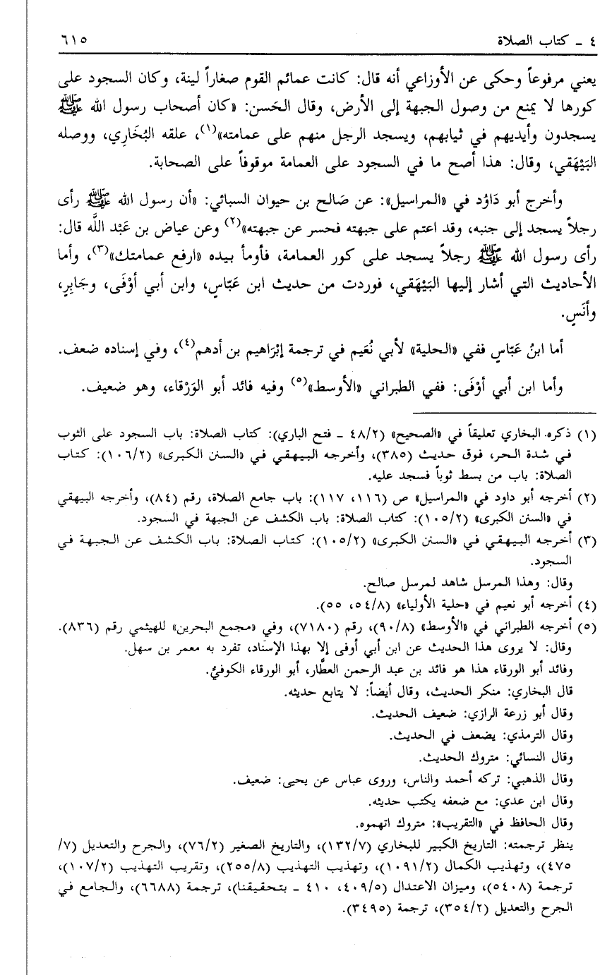 وَأَخْرَجَ أَبُو دَاوُد فِي الْمَرَاسِيلِ عَنْ صَالِحِ بْنِ حيوان السبائي: أَنَّ رَسُولَ اللَّهِ صَلَّى اللَّهُ عَلَيْهِ وَسَلَّمَ رَأَى رَجُلًا يَسْجُدُ إلَى جَنْبِهِ وَقَدْ اعْتَمَّ عَلَى جَبْهَتِهِ فَحَسَرَ عَنْ جَبْهَتِهِ2 وَعَنْ عِيَاضِ بْنِ عَبْدِ اللَّهِ قَالَ: رَأَى رَسُولُ اللَّهِ صَلَّى اللَّهُ عَلَيْهِ وَسَلَّمَ رَجُلًا يَسْجُدُ عَلَى كَوْرِ الْعِمَامَةِ فَأَوْمَأَ بِيَدِهِ "ارْفَعْ عِمَامَتَكَ" 3 وَأَمَّا الْأَحَادِيثُ الَّتِي أَشَارَ إلَيْهَا الْبَيْهَقِيُّ فَوَرَدَتْ مِنْ حَدِيثِ ابْنِ عَبَّاسٍ وَابْنِ أَبِي أَوْفَى وَجَابِرٍ وَأَنَسٍ