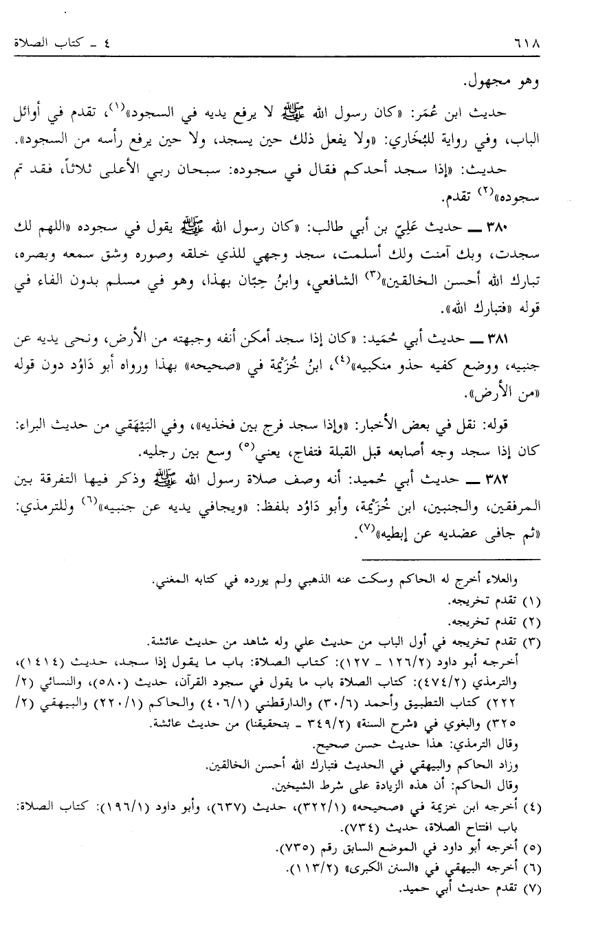 382 - حَدِيثُ أَبِي حُمَيْدٍ أَنَّهُ وَصَفَ صَلَاةَ رَسُولِ اللَّهِ صَلَّى اللَّهُ عَلَيْهِ وَسَلَّمَ وَذَكَرَ فِيهَا التَّفْرِقَةَ بَيْنَ الْمِرْفَقَيْنِ وَالْجَنْبَيْنِ ابْنُ خُزَيْمَةَ وَأَبُو دَاوُد بِلَفْظِ: وَيُجَافِي يَدَيْهِ عَنْ جَنْبَيْهِ6 وَلِلتِّرْمِذِيِّ ثُمَّ جَافَى عَضُدَيْهِ عَنْ إبِطَيْهِ7