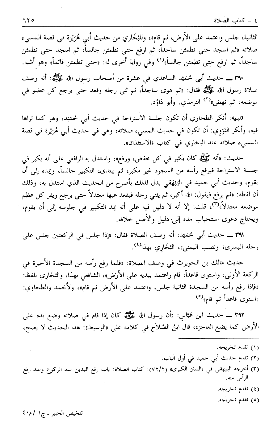 حَدِيثُ مَالِكِ بْنِ الْحُوَيْرِثِ فِي وَصْفِ الصَّلَاةِ: فَلَمَّا رَفَعَ رَأْسَهُ مِنْ السَّجْدَةِ الْأَخِيرَةِ فِي الرَّكْعَةِ الْأُولَى وَاسْتَوَى قَاعِدًا قَامَ وَاعْتَمَدَ بِيَدَيْهِ عَلَى الْأَرْضِ. الشَّافِعِيُّ بِهَذَا وَالْبُخَارِيُّ بِلَفْظِ: فَإِذَا رَفَعَ رَأْسَهُ مِنْ السَّجْدَةِ الثَّانِيَةِ جَلَسَ وَاعْتَمَدَ عَلَى الْأَرْضِ ثُمَّ قَامَ وَلِأَحْمَدَ وَالطَّحَاوِيِّ اسْتَوَى قَاعِدًا ثُمَّ قَامَ5