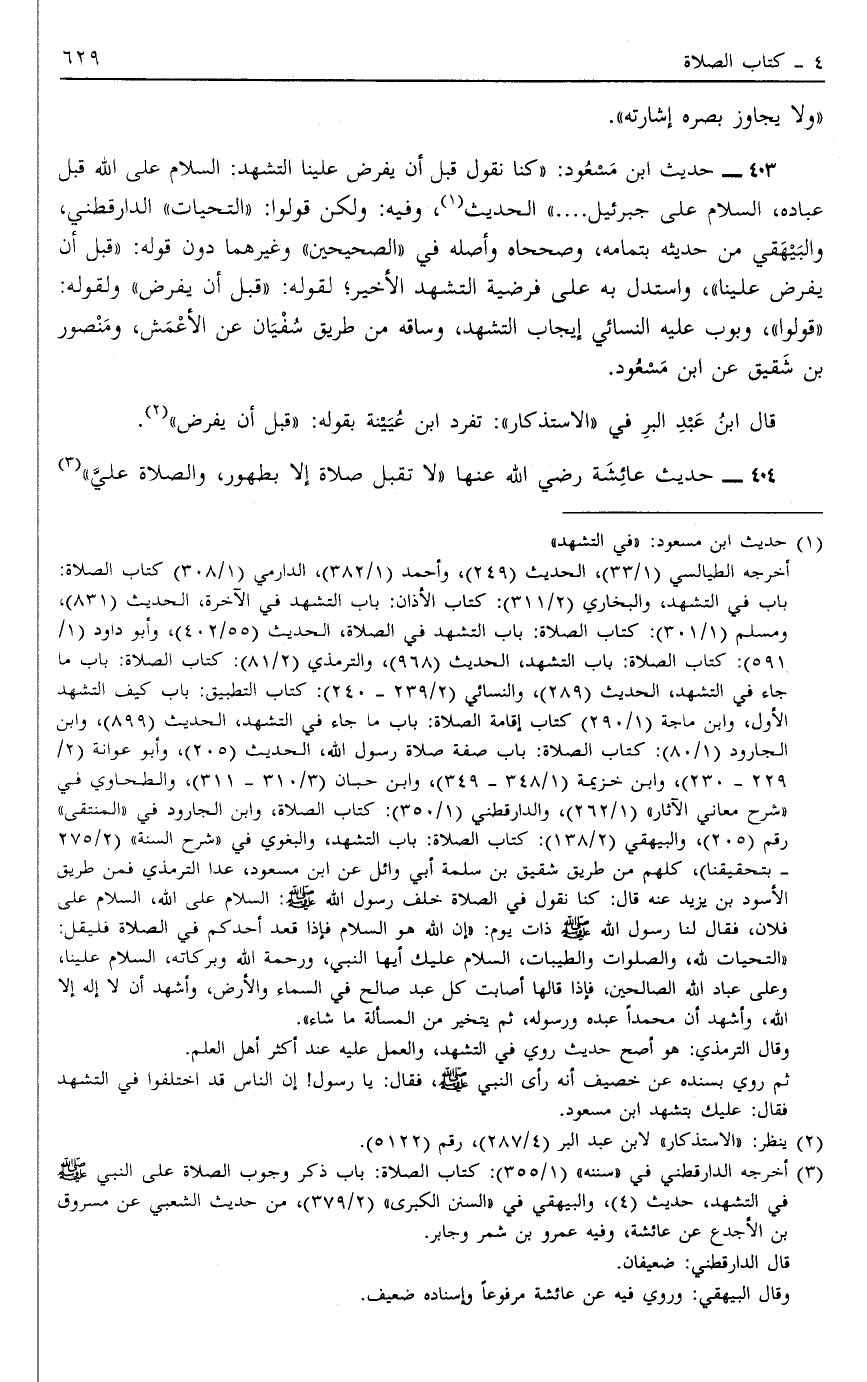 403 - حَدِيثُ ابْنِ مَسْعُودٍ: كُنَّا نَقُولُ: قَبْلَ أَنْ يُفْرَضَ عَلَيْنَا التَّشَهُّدُ السَّلَامُ عَلَى اللَّهِ قَبْلَ عِبَادِهِ السَّلَامُ عَلَى جَبْرَائِيلَ الْحَدِيثُ1 وَفِيهِ: "وَلَكِنْ قُولُوا: التَّحِيَّاتُ" الدَّارَقُطْنِيُّ وَالْبَيْهَقِيُّ مِنْ حَدِيثِهِ بِتَمَامِهِ وَصَحَّحَاهُ وَأَصْلُهُ فِي الصَّحِيحَيْنِ وَغَيْرِهِمَا دُونَ قَوْلِهِ: قَبْلَ أَنْ يُفْرَضَ عَلَيْنَا وَاسْتَدَلَّ بِهِ على فرضية التشهد الأخير لِقَوْلِهِ: قَبْلَ أَنْ يُفْرَضَ وَلِقَوْلِهِ: "قُولُوا" وَبَوَّبَ عَلَيْهِ النَّسَائِيُّ إيجَابَ التَّشَهُّدِ وَسَاقَهُ مِنْ طَرِيقِ سُفْيَانَ عَنْ الْأَعْمَشِ وَمَنْصُورٍ عَنْ شَقِيقٍ عَنْ ابْنِ مَسْعُودٍ قَالَ ابْنُ عَبْدِ الْبَرَّ فِي الِاسْتِذْكَارِ: تَفَرَّدَ ابْنُ عُيَيْنَةَ بِقَوْلِهِ: قَبْلَ أَنْ يُفْرَضَ2