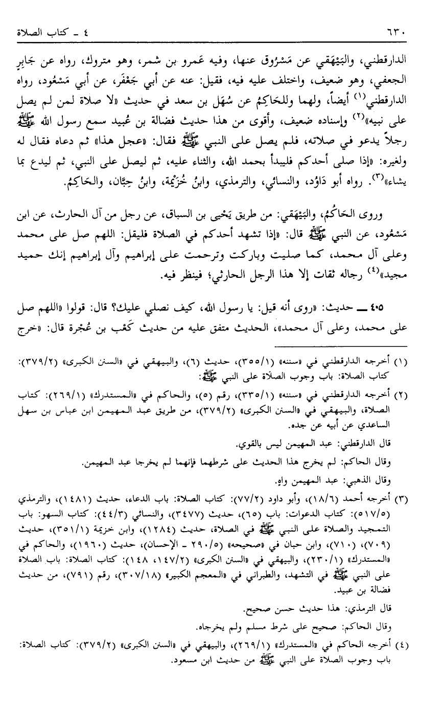 الدَّارَقُطْنِيُّ وَالْبَيْهَقِيُّ عَنْ مَسْرُوقٍ عَنْهَا وَفِيهِ عَمْرُو بْنُ شِمْرٍ وَهُوَ مَتْرُوكٌ رواه عَنْ جَابِرٍ الْجُعْفِيِّ وَهُوَ ضَعِيفٌ وَاخْتُلِفَ عَلَيْهِ فِيهِ فَقِيلَ عَنْهُ عَنْ أَبِي جَعْفَرٍ عَنْ أَبِي مَسْعُودٍ رَوَاهُ الدَّارَقُطْنِيُّ1 أَيْضًا وَلَهُمَا وَلِلْحَاكِمِ عَنْ سَهْلِ بْنِ سَعْدٍ فِي حَدِيثِ: "لَا صَلَاةَ لِمَنْ لَمْ يُصَلِّ عَلَى نَبِيِّهِ" 2 وَإِسْنَادُهُ ضَعِيفٌ وَأَقْوَى مِنْ هَذَا حَدِيثُ فَضَالَةَ بْنِ عُبَيْدٍ سَمِعَ رَسُولُ اللَّهِ صَلَّى اللَّهُ عَلَيْهِ وَسَلَّمَ رَجُلًا يَدْعُو فِي صَلَاتِهِ فَلَمْ يُصَلِّ عَلَى النَّبِيِّ صَلَّى اللَّهُ عَلَيْهِ وَسَلَّمَ فَقَالَ: "عَجَّلَ هذا" ثم دعاه فَقَالَ لَهُ وَلِغَيْرِهِ: "إذَا صَلَّى أَحَدُكُمْ فَلْيَبْدَأْ بِحَمْدِ اللَّهِ وَالثَّنَاءِ عَلَيْهِ ثُمَّ لْيُصَلِّ عَلَى النَّبِيِّ ثُمَّ ليدع بما يشاء" 3 رَوَاهُ أَبُو دَاوُد وَالنَّسَائِيُّ والترمدي وَابْنُ خُزَيْمَةَ وَابْنُ حِبَّانَ وَالْحَاكِمُ