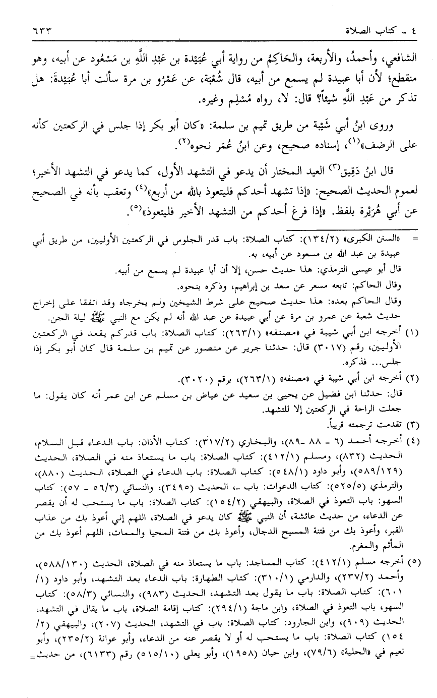 = "السنن الكبرى""2/134": كتاب الصلاة: باب قدر الجلوس في الركعتين الأوليين، من طريق أبي عبيدة بن عبد الله بن مسعود عن أبيه، به.