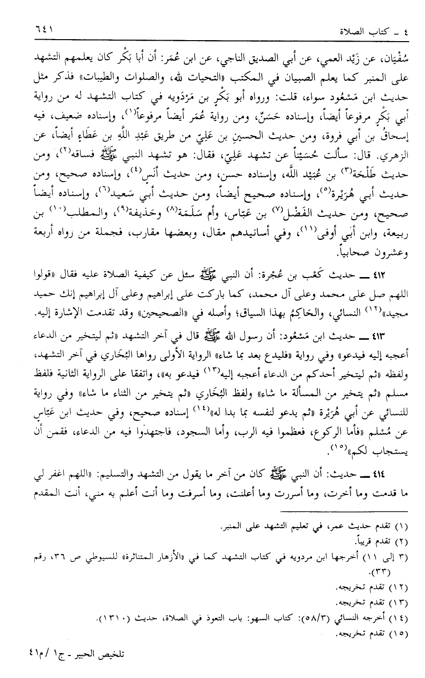 413 - حَدِيثُ ابْنُ مَسْعُودٍ: أَنَّ رَسُولَ اللَّهِ صَلَّى اللَّهُ عَلَيْهِ وَسَلَّمَ قَالَ فِي آخِرِ التشهد: "ثم ليتخير مِنْ الدُّعَاءِ أَعْجَبَهُ إلَيْهِ 13 فيدعو به" وَفِي رِوَايَةٍ: "فَلْيَدْعُ بَعْدُ بِمَا شَاءَ" الرِّوَايَةُ الْأُولَى: رَوَاهَا الْبُخَارِيُّ فِي آخِرِ التَّشَهُّدِ وَلَفْظُهُ: "ثُمَّ لْيَتَخَيَّرْ أَحَدُكُمْ مِنْ الدُّعَاءِ أَعْجَبَهُ إلَيْهِ فَيَدْعُو بِهِ" وَاتَّفَقَا عَلَى الرِّوَايَةِ الثَّانِيَةِ فَلَفْظُ مُسْلِمٍ: "ثُمَّ يَتَخَيَّرُ مِنْ الْمَسْأَلَةِ مَا شَاءَ" وَلَفْظُ الْبُخَارِيِّ: "ثُمَّ يَتَخَيَّرُ مِنْ الثَّنَاءِ مَا شَاءَ" وَفِي رِوَايَةٍ لِلنَّسَائِيِّ عَنْ أَبِي هُرَيْرَةَ: "ثُمَّ يَدْعُو لِنَفْسِهِ بِمَا بَدَا لَهُ" 14 إسْنَادُهُ صَحِيحٌ وَفِي حَدِيثِ ابْنِ عَبَّاسٍ عِنْدَ مُسْلِمٍ: "فَأَمَّا الرُّكُوعُ فَعَظِّمُوا فِيهِ الرَّبَّ وَأَمَّا السُّجُودُ فَاجْتَهِدُوا فِيهِ مِنْ الدُّعَاءِ فَقَمِنٌ أَنْ يُسْتَجَابَ لَكُمْ" 15