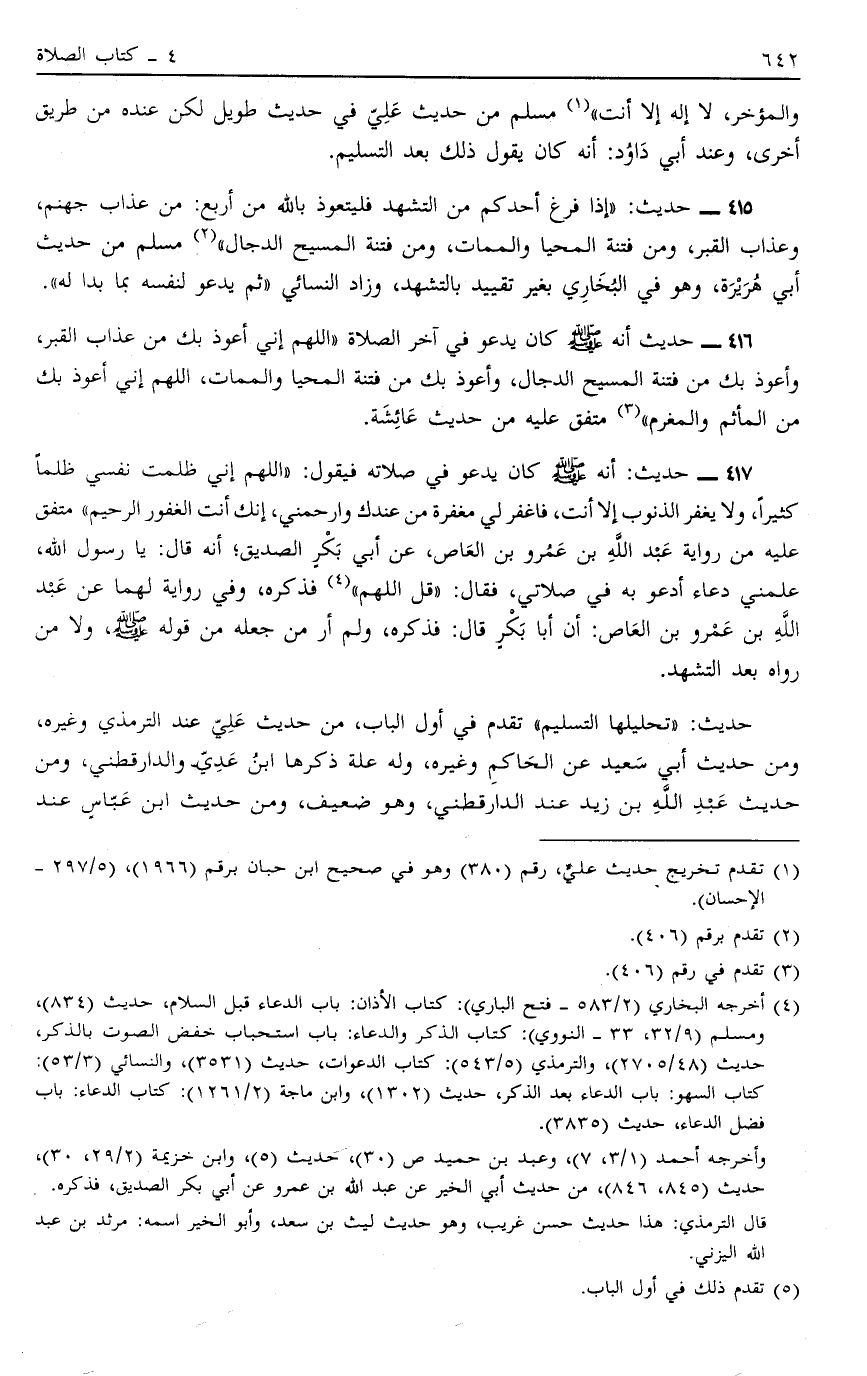 417 - حَدِيثُ أَنَّهُ صَلَّى اللَّهُ عَلَيْهِ وَسَلَّمَ كَانَ يَدْعُو فِي صَلَاتِهِ فَيَقُولُ: "اللَّهُمَّ إنِّي ظَلَمْتُ نَفْسِي ظُلْمًا كَثِيرًا وَلَا يَغْفِرُ الذُّنُوبَ إلَّا أَنْتَ فَاغْفِرْ لِي مَغْفِرَةً مِنْ عِنْدِكَ وَارْحَمْنِي إنَّكَ أَنْتَ الْغَفُورُ الرَّحِيمُ". مُتَّفَقٌ عَلَيْهِ مِنْ رِوَايَةِ عَبْدِ اللَّهِ بْنِ عَمْرِو بْنِ الْعَاصِ عَنْ أَبِي بَكْرٍ الصِّدِّيقِ أَنَّهُ قَالَ: يَا رَسُولَ اللَّهِ عَلِّمْنِي دُعَاءً أَدْعُو بِهِ فِي صَلَاتِي فَقَالَ: "قُلْ: اللَّهُمَّ.." 4 فَذَكَرَهُ وَفِي رِوَايَةٍ لَهُمَا عَنْ عَبْدِ اللَّهِ بْنِ عَمْرِو بْنِ الْعَاصِ أَنَّ أَبَا بَكْرٍ قَالَ فَذَكَرَهُ وَلَمْ أَرَ مَنْ جَعَلَهُ مِنْ قَوْلِهِ صَلَّى اللَّهُ عَلَيْهِ وَسَلَّمَ وَلَا مَنْ رَوَاهُ بَعْدَ التَّشَهُّدِ.