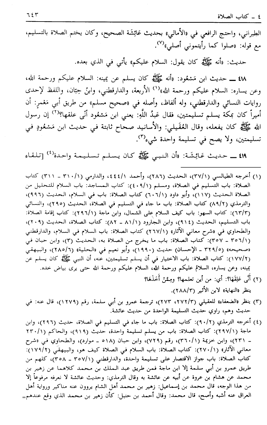 418 - حَدِيثُ ابْنِ مَسْعُودٍ: أَنَّهُ صَلَّى اللَّهُ عَلَيْهِ وَسَلَّمَ كَانَ يُسَلِّمُ عَنْ يَمِينِهِ "السَّلَامُ عَلَيْكُمْ وَرَحْمَةُ اللَّهِ" وَعَنْ يَسَارِهِ: "السَّلَامُ عَلَيْكُمْ وَرَحْمَةُ اللَّهِ" 2 الْأَرْبَعَةُ وَالدَّارَقُطْنِيّ وَابْنُ حِبَّانَ وَاللَّفْظُ لِإِحْدَى رِوَايَاتِ النَّسَائِيّ وَالدَّارَقُطْنِيّ وَلَهُ أَلْفَاظٌ وَأَصْلُهُ فِي صَحِيحِ مُسْلِمٍ مِنْ طَرِيقِ أَبِي مَعْمَرٍ أَنَّ أَمِيرًا كَانَ بِمَكَّةَ يُسَلِّمُ تَسْلِيمَتَيْنِ فَقَالَ عَبْدُ اللَّهِ يَعْنِي ابْنَ مَسْعُودٍ أَنَّى عَلَّقَهَا3 إنَّ رَسُولَ اللَّهِ صَلَّى اللَّهُ عَلَيْهِ وَسَلَّمَ كَانَ يَفْعَلُهُ وَقَالَ الْعُقَيْلِيُّ: وَالْأَسَانِيدُ صِحَاحٌ ثَابِتَةٌ فِي حَدِيثِ ابْنِ مَسْعُودٍ فِي تَسْلِيمَتَيْنِ: وَلَا يَصِحُّ فِي تَسْلِيمَةٍ وَاحِدَةٍ شَيْءٌ4