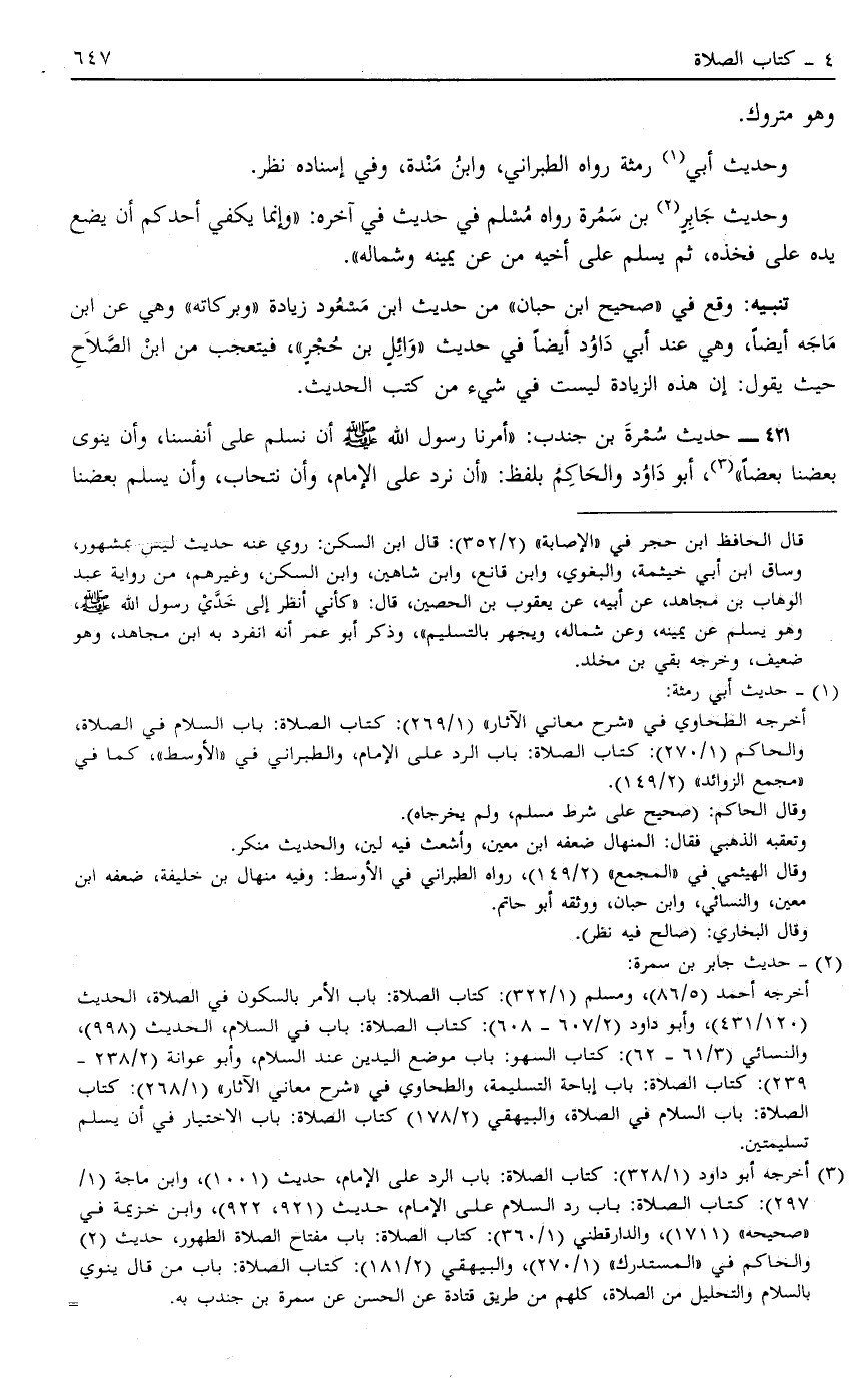 421 - حَدِيثُ سَمُرَةَ بْنِ جُنْدُبٍ: أَمَرَنَا رَسُولُ اللَّهِ صَلَّى اللَّهُ عَلَيْهِ وَسَلَّمَ أَنْ نُسَلِّمَ عَلَى أَنْفُسِنَا وَأَنْ يَنْوِيَ بَعْضُنَا بَعْضًا3 أَبُو دَاوُد وَالْحَاكِمُ بِلَفْظِ: أَنْ نَرُدَّ عَلَى الْإِمَامِ وَأَنْ نَتَحَابَّ وَأَنْ يُسَلِّمَ بَعْضُنَا