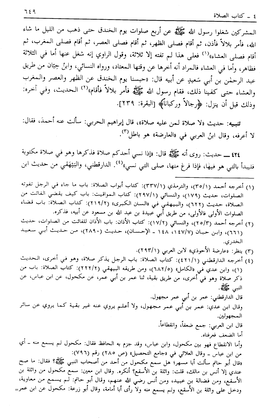 الْمُشْرِكِينَ شَغَلُوا رَسُولَ اللَّهِ صَلَّى اللَّهُ عَلَيْهِ وَسَلَّمَ عَنْ أَرْبَعِ صَلَوَاتٍ يَوْمَ الْخَنْدَقِ حَتَّى ذَهَبَ مِنْ اللَّيْلِ مَا شَاءَ اللَّهُ فَأَمَرَ بِلَالًا فَأَذَّنَ ثُمَّ أَقَامَ فَصَلَّى الظُّهْرَ ثُمَّ أَقَامَ فَصَلَّى الْعَصْرَ ثُمَّ أَقَامَ فَصَلَّى الْمَغْرِبَ ثُمَّ أَقَامَ فَصَلَّى الْعِشَاءَ1 فَعَلَى هَذَا لَمْ تَفُتْهُ إلَّا ثَلَاثَةٌ وَقَوْلُ الرَّاوِي إنَّهُ شُغِلَ عَنْهَا أَمَّا فِي الثَّلَاثَةِ فَظَاهِرٌ وَأَمَّا فِي الْعِشَاءِ فَالْمُرَادُ أَنَّهُ أَخَّرَهَا عَنْ وَقْتِهَا الْمُعْتَادِ وَرَوَاهُ النَّسَائِيُّ وَابْنُ حِبَّانَ مِنْ طَرِيقِ عَبْدِ الرَّحْمَنِ بْنِ أَبِي سَعِيدٍ عَنْ أَبِيهِ قَالَ حُبِسْنَا يَوْمَ الْخَنْدَقِ عَنْ الظُّهْرِ وَالْعَصْرِ وَالْمَغْرِبِ وَالْعِشَاءِ حَتَّى كُفِينَا ذَلِكَ فَقَامَ رَسُولُ اللَّهِ صَلَّى اللَّهُ عَلَيْهِ وَسَلَّمَ فَأَمَرَ بِلَالًا فَأَقَامَ2 الْحَدِيثُ وَفِي آخِرِهِ وَذَلِكَ قبل أن ينزل: {فَرِجَالاً أَوْ رُكْبَاناً} [البقرة: 239]