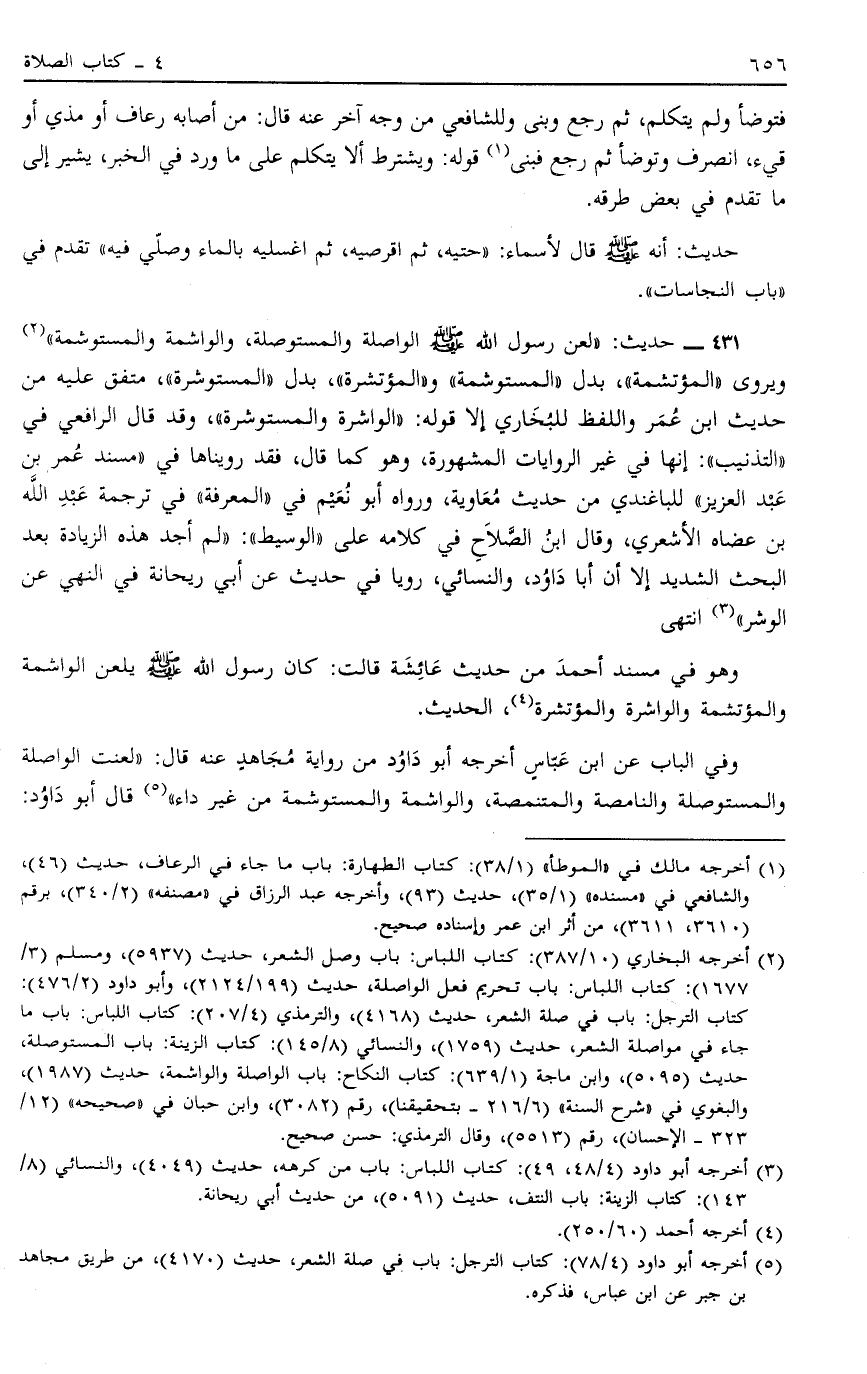 431 - حَدِيثُ: لَعَنَ رَسُولُ اللَّهِ صَلَّى اللَّهُ عَلَيْهِ وَسَلَّمَ الْوَاصِلَةَ وَالْمُسْتَوْصِلَةَ وَالْوَاشِمَةَ وَالْمُسْتَوْشِمَةَ وَالْوَاشِرَةَ وَالْمُسْتَوْشِرَةَ,2 وَيُرْوَى: المؤتشمة بدل: المستوشمة, والمؤتشرة بَدَلَ الْمُسْتَوْشِرَةَ, مُتَّفَقٌ عَلَيْهِ مِنْ حَدِيثِ ابْنِ عُمَرَ وَاللَّفْظُ لِلْبُخَارِيِّ إلَّا قَوْلَهُ: الْوَاشِرَةَ وَالْمُسْتَوْشِرَةَ وَقَدْ قَالَ الرَّافِعِيُّ فِي التَّذْنِيبِ: إنَّهَا فِي غَيْرِ الرِّوَايَاتِ الْمَشْهُورَةِ وَهُوَ كَمَا قَالَ فَقَدْ رَوَيْنَاهَا فِي مُسْنَدِ عُمَرَ بْنِ عَبْدِ الْعَزِيزِ لِلْبَاغَنْدِيِّ مِنْ حَدِيثِ مُعَاوِيَةَ وَرَوَاهُ أَبُو نُعَيْمٍ فِي الْمَعْرِفَةِ فِي تَرْجَمَةِ عَبْدِ اللَّهِ بْنِ عضاة الْأَشْعَرِيِّ وَقَالَ ابْنُ الصَّلَاحِ فِي كَلَامِهِ عَلَى الْوَسِيطِ لَمْ أَجِدْ هَذِهِ الزِّيَادَةَ بَعْدَ الْبَحْثِ الشَّدِيدِ إلَّا أَنَّ أَبَا دَاوُد وَالنَّسَائِيَّ رَوَيَا فِي حَدِيثٍ عَنْ أَبِي رَيْحَانَةَ فِي النَّهْيِ عَنْ الْوَشْرِ3 انْتَهَى