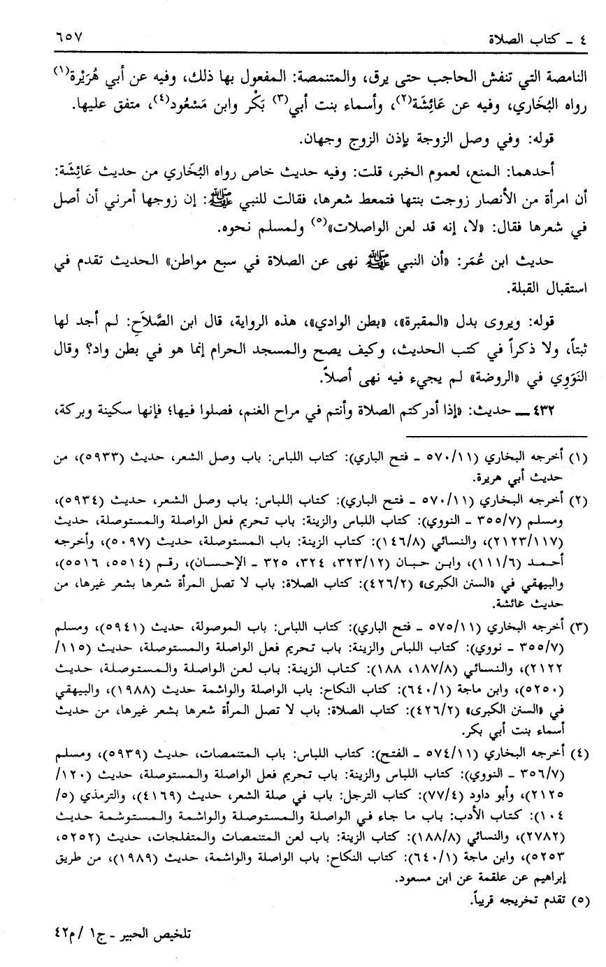 النَّامِصَةُ الَّتِي تَنْقُشُ الْحَاجِبَ حَتَّى يَرِقَّ وَالْمُتَنَمِّصَةُ: الْمَفْعُولُ بِهَا ذَلِكَ وَفِيهِ عَنْ أَبِي هُرَيْرَةَ1 رَوَاهُ الْبُخَارِيُّ وَفِيهِ عَنْ عَائِشَةَ2 وَأَسْمَاءَ بِنْتِ أَبِي3 بَكْرٍ وَابْنِ مَسْعُودٍ4 مُتَّفَقٌ عَلَيْهَا