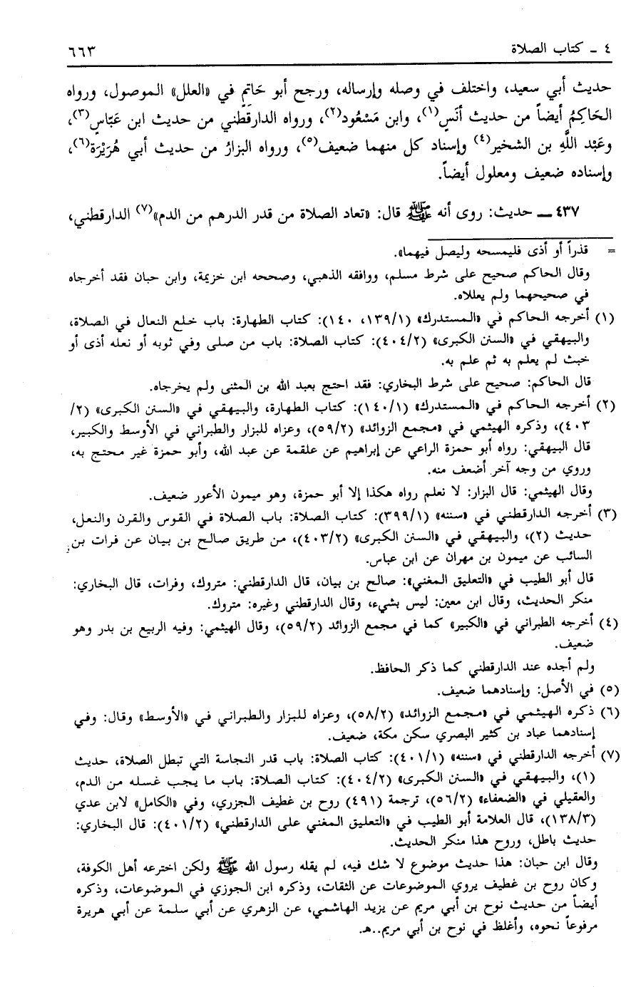 437 - حَدِيثُ: رُوِيَ أَنَّهُ صَلَّى اللَّهُ عَلَيْهِ وَسَلَّمَ قَالَ: "تُعَادُ الصَّلَاةُ مِنْ قَدْرِ الدِّرْهَمِ مِنْ الدَّمِ"7 الدَّارَقُطْنِيُّ