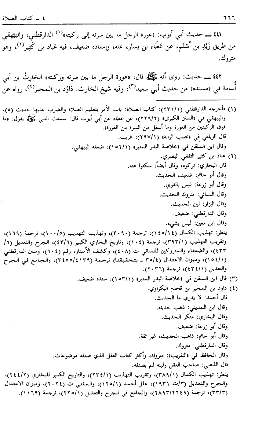 441 - حَدِيثُ أَبِي أَيُّوبَ: "عَوْرَةُ الرَّجُلِ مَا بَيْنَ سُرَّتِهِ إلَى رُكْبَتِهِ" 1 الدَّارَقُطْنِيُّ وَالْبَيْهَقِيُّ مِنْ طَرِيقِ زَيْدِ بْنِ أَسْلَمَ عَنْ عَطَاءِ بْنِ يَسَارٍ عَنْهُ وَإِسْنَادُهُ ضَعِيفٌ فِيهِ عَبَّادُ بْنُ كَثِيرٍ2 وَهُوَ مَتْرُوكٌ