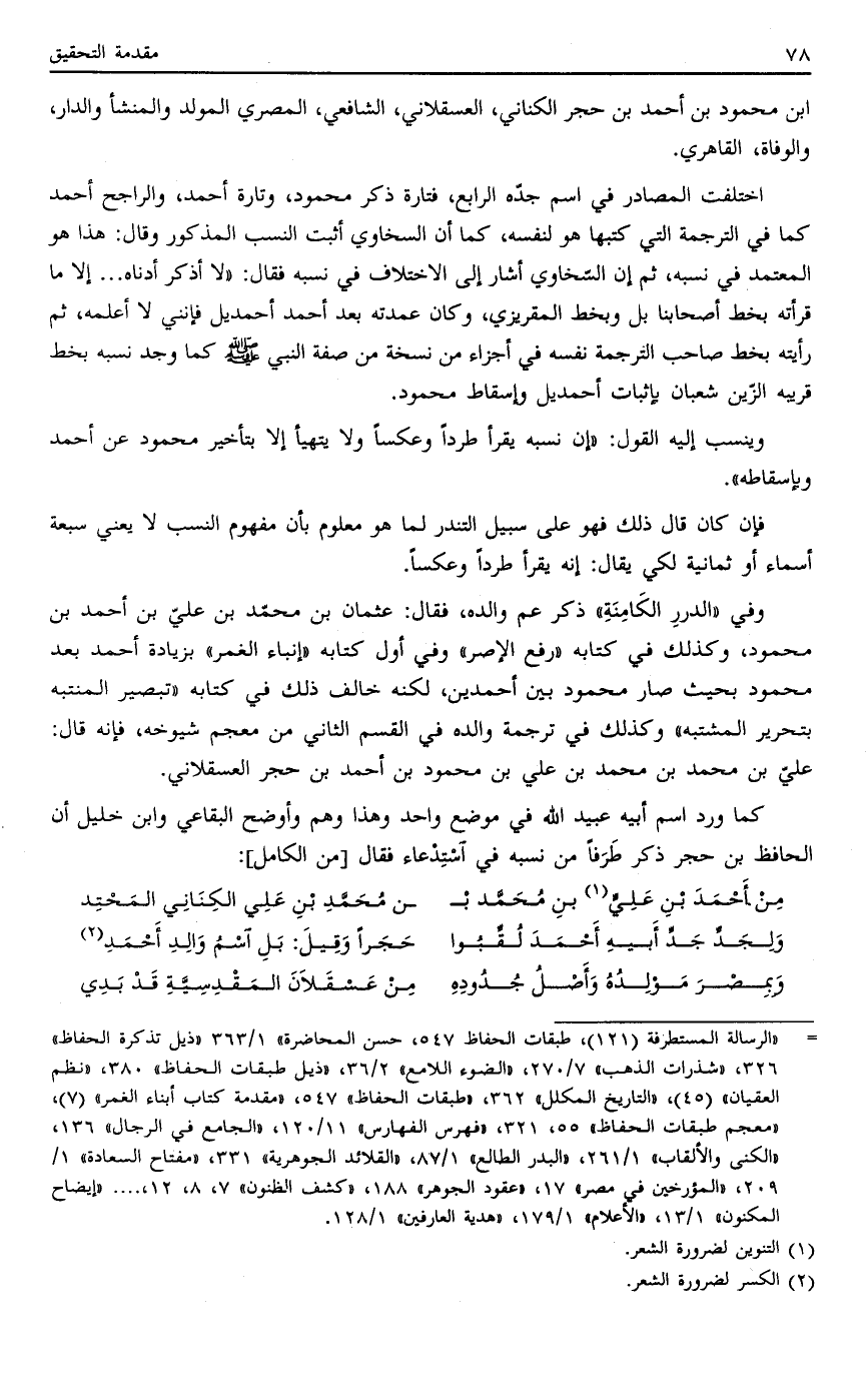 وفي "الدررِ الكامنة" ذكر عم والده، فقال: عثمان بن محمد بن علي بن أحمد بن محمود، وكذلك في كتابه "رفع الإصر" وفى أول كتابه "إنباء الغمر" بزيادة أحمد بعد محمود بحيث صار محمود بين أحمدين، لكنه خالف ذلك في كتابه "تبصير المنتبه بتحرير المشتبه" وكذلك في ترجمة والده في القسم الثاني من معجم شيوخه، فإنه قال: علي بن محمد بن محمد بن علي بن محمود بن أحمد بن حجر العسقلاني.