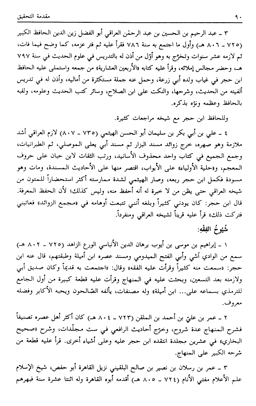 3- عبد الرحيم بن الحسين بن عبد الرحمن العراقي أبو الفضل زين الدين الحافظ الكبير "725-806هـ" وأول ما اجتمع به سنة 786 فقرأ عليه ثم فتر عزمه، كما وضح فيما فات، ثم لازمه عشر سنوات وتخرج به وهو أوّل من أذن له بالتدريس في علوم الحديث في سنّة 797هـ، وحضر مجالس إملائه، وقرأ عليه كتابه "الأربعين العشارية "من جمعه واستملى عليه الحافظ ابن حجر في غياب ولده أبي زرعة، وحمل عنه جملة مستكثرة من أماليه، وأذن له في تدريس ألفيته من الحديث، وشرحها، والنكت على ابن الصلاح، وسائر كتب الحديث وعلومه، ولقبه بالحافظ وعظمه ونوّه بذكره.