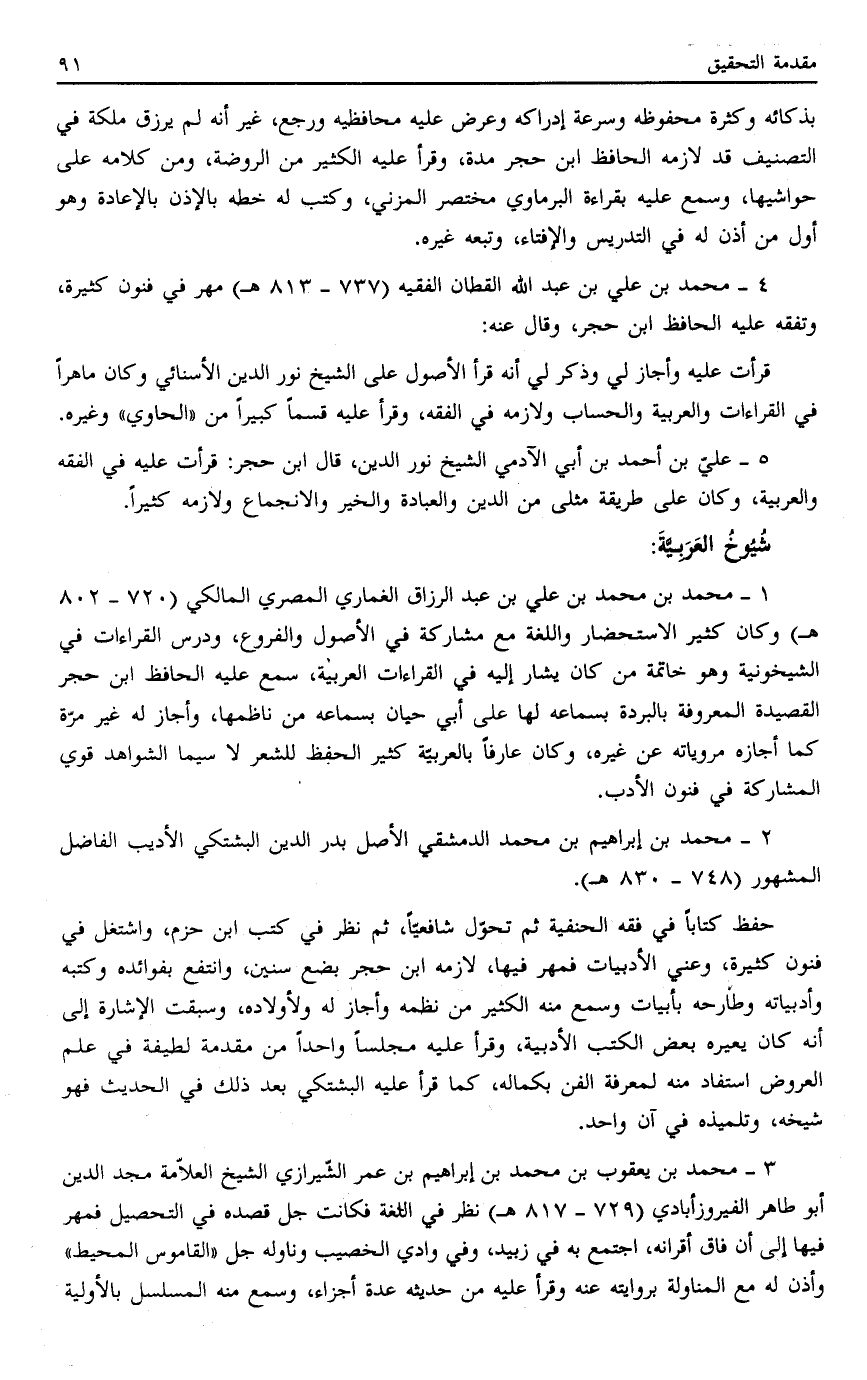 3- محمد بن يعقوب بن محمد بن إبراهيم بن عمر الشيرازي الشيخ العلامة مجد الدين أبو طاهر الفيروزأبادي "729- 817 هـ" نظر في اللغة فكانت جل قصده في التحصيل فمهر فيها إلى أن فاق أقرانه، اجتمع به في زبيد، وفي وادي الخصيب وناوله جل "القاموس المحيط" وأذن له مع المناولة بروايته عنه وقرأ عليه من حديثه عدة أجزاء، وسمع منه المسلسل بالأولية