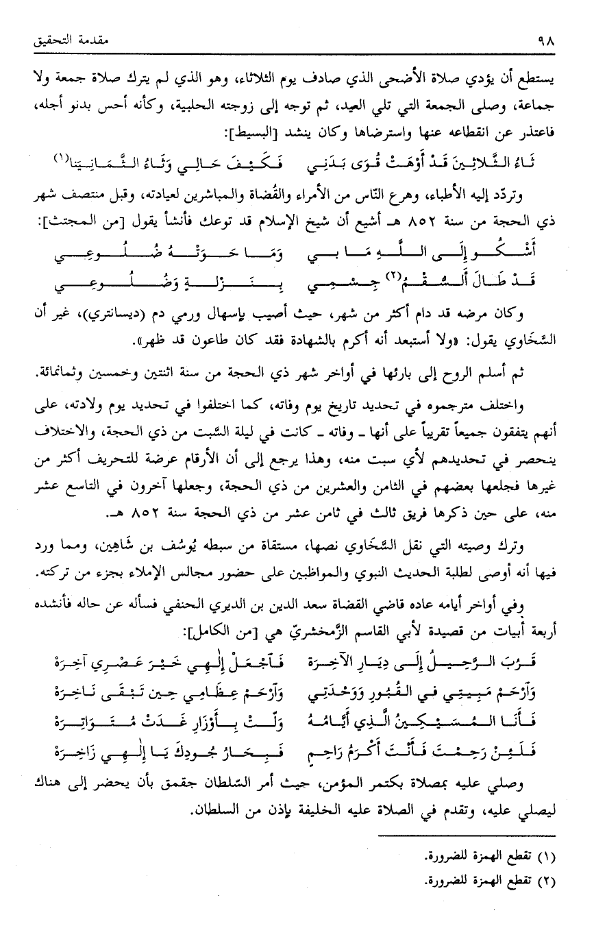 وتردد إليه الأطباء، وهرع الناس من الأمراء والقضاة والمباشرين لعيادته، وقبل منتصف شهر ذي الحجة من سنّة 852 هـ أشيع أن شيخ الإسلام قد توعك فأنشأ يقول [من المجتث] :