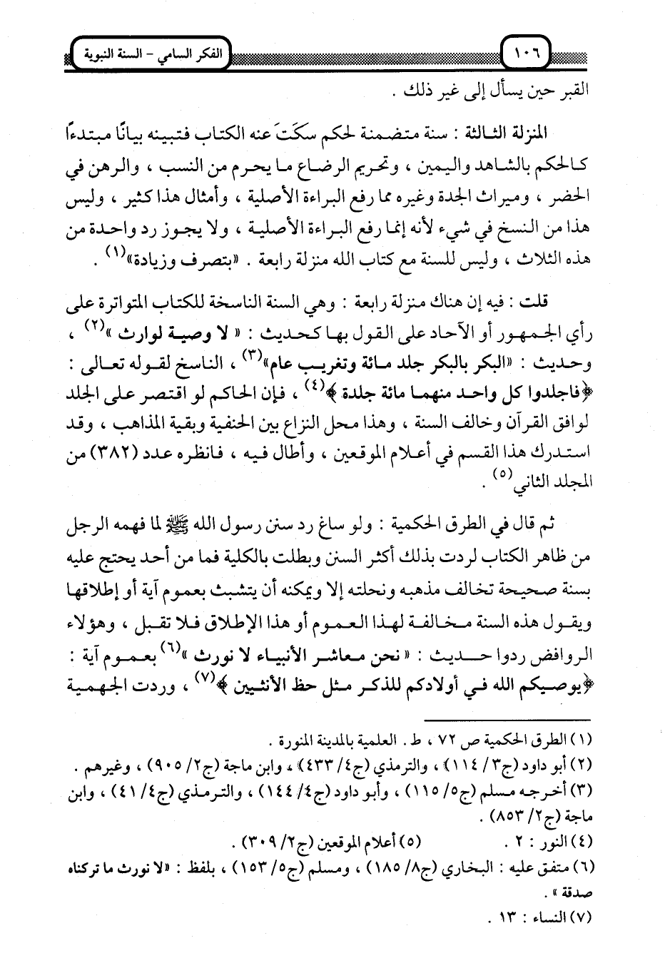 قلت فيه: إن هناك منزلة رابعة: وهي السنة الناسخة للكتاب المتواترة على رأي الجمهور, أو الآحاد على القول بها كحديث: "لا وصية لوراث" 2، وحديث: "البكر بالبكر جلد مائة وتغريب عام" 3، الناسخ لقوله تعالى: {فَاجْلِدُوا كُلَّ وَاحِدٍ مِنْهُمَا مِائَةَ جَلْدَةٍ} 4، فإن الحاكم لو اقتصر على الجلد لوافق القرآن وخالف السنة، وهذا محل النزاع بين الحنفية وبقية المذاهب، وقد استدرك هذا القسم في أعلام الموقعين، وأطال فيه، فانظره عدد "382"من المجلد الثاني5.