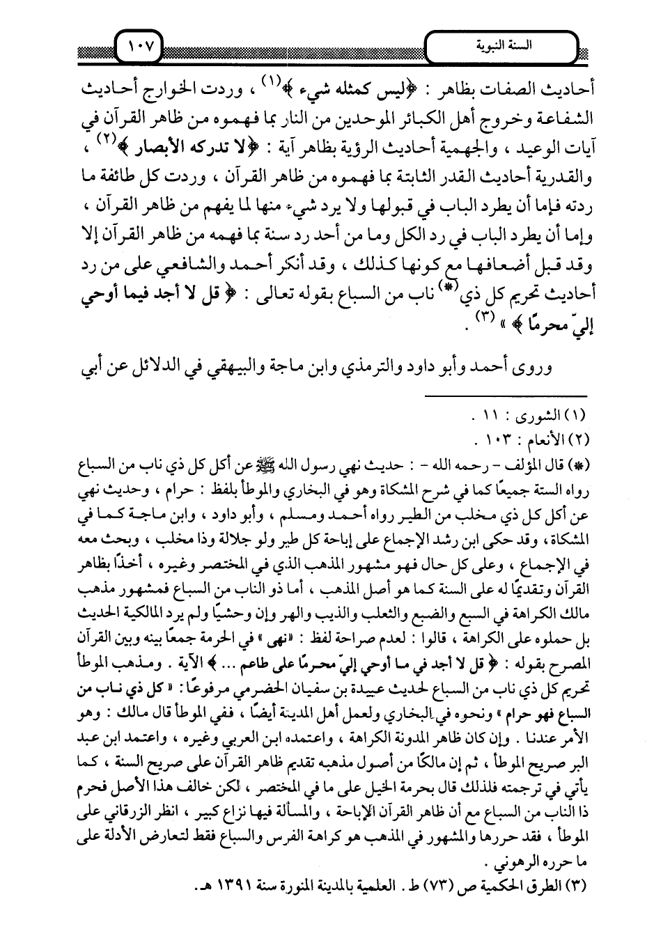 3 قال المؤلف -رحمه الله: حديث نهي رسول الله -صلى الله عليه وسلم- عن أكل كلِّ ذي ناب من السباع رواه الستة جميعًا كما في شرح المشكاة, وهو في البخاري والموطأ بلفظ: وحديث نهي عن أكل كل ذي مخلب من الطير. رواه أحمد ومسلم، وأبو داود، وابن ماجة كما في المشكاة، وقد حكى ابن رشد الإجماع على إباحة كل طير ولو جلّالة وذا مخلب، وبحث معه في الإجماع، وعلى كل حالٍ فهو مشهور المذهب الذي في المختصر وغيره، أخذًا بظاهر القرآن وتقديمًا له على السنة كما هو أصل المذهب, أما ذو الناب من السباع: فمشهور مذهب مالك الكراهة في السبع والضبع والثعلب والذيب والهر وإن وحشيًّا, ولم يردّ المالكية الحديث بل حملوه على الكراهة، قالوا: لعدم صراحة لفظ:"نهى" في الحرمة جمعًا بينه وبين القرآن المصرح بقوله: {قُلْ لَا أَجِدُ فِي مَا أُوحِيَ إِلَيَّ مُحَرَّمًا عَلَى طَاعِمٍ..} الآية. ومذهب الموطأ: تحريم كل ذي ناب من السباع لحديث عبيدة بن سفيان الحضرميّ مرفوعًا: "كل ذي ناب من السباع فهو حرام" ونحوه في البخاري, ولعمل أهل المدينة أيضًا، ففي الموطأ قال مالك: وهو الأمر عندنا. وإن كان ظهر المدونة الكراهة، واعتمده ابن العربي وغيره، واعتمد ابن عبد البر صريح الموطأ، ثم إن مالكًا من أصول مذهبه تقديم ظاهر القرآن على صريح السنة، كما يأتي في ترجمته, فلذلك قال بحرمة الخيل على ما في المختصر، لكن خالف هذا الأصل فحرم ذا الناب من السباع, من أن ظاهر القرآن الإباحة، المسألة فيها نزاع كبير، انظر الزرقاني على الموطأ فقد حررها, والمشهور في المذهب هو كراهة الفرس والسباع فقط, لتعارض الأدلة على ماحرره الرهوني.