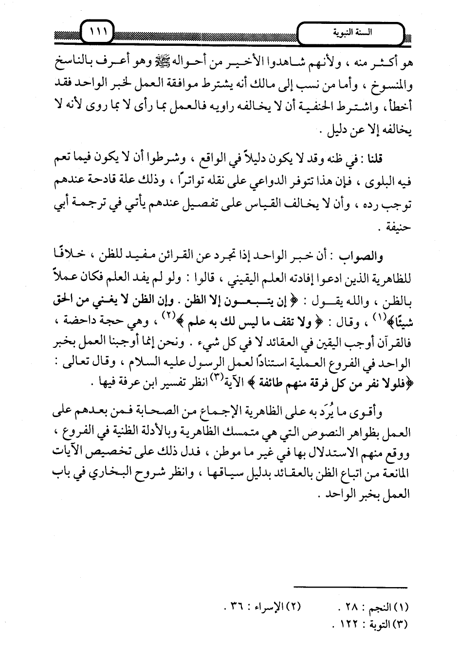 والصواب: أن خبر الواحد إذا تجرَّدَ عن القرائن مفيد للظن، خلافًا للظاهرية الذين ادَّعوا إفادته العلم اليقيني، قالوا: ولو لم يفد العلم فكان علمًا بالظن، والله يقول: {إِنْ يَتَّبِعُونَ إِلَّا الظَّنَّ وَإِنَّ الظَّنَّ لَا يُغْنِي مِنَ الْحَقِّ شَيْئًا} 1، وقال: {وَلا تَقْفُ مَا لَيْسَ لَكَ بِهِ عِلْمٌ} 2، وهي حجة داحضة، فالقرآن أوجب اليقين في العقائد لا في كل شيء, ونحن إنما أوجبنا العمل بخبر الواحد في الفروع العملية استنادًا لعمل الرسول -عليه السلام، وقال تعالى: {فَلَوْلَا نَفَرَ مِنْ كُلِّ فِرْقَةٍ مِنْهُمْ طَائِفَةٌ} الآية3. انظر تفسير ابن عرفه فيها.