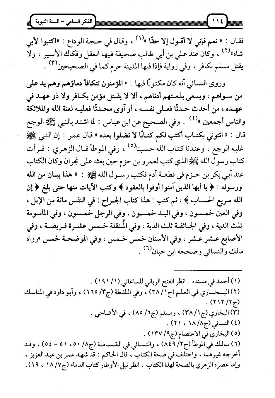 وروى النسائي أنه كان مكتوبًا فيها: "المؤمنون تتكافأ دماؤهم, وهم يدٌ على من سواهم، ويسعى بذمتهم أدناهم، ألا لا يُقْتَلُ مؤمن بكافر, ولا ذو عهده في عهده، ومن أحدث حدثًا فعلى نفسه، أو آوى محدثًا فعليه لعنة الله والملائكة والناس أجمعين" 4. وفي الصحيح عن ابن عباس, لما اشتدَّ بالنبي -صلى الله عليه وسلم- الوجع قال: "ائتوني بكتاب أكتب لكم كتابًا لا تضلوا بعده" , قال عمر: إن النبي غلبه الوجع، وعندنا كتاب الله حسبنا5، وفي الموطأ قال الزهري: قرأت كتاب رسول الله -صلى الله عليه وسلم, الذي كتب لعمرو بن حزم حين بعثه على نجران, وكان الكتاب عند أبي بكر بن حزم في قطعة أدم, فكتب رسول الله -صلى الله عليه وسلم: "هذا بيان من الله وسوله: {يَا أَيُّهَا الَّذِينَ آمَنُوا أَوْفُوا بِالْعُقُودِ} وكتب الآيات منها حتى بلغ {إِنَّ اللَّهَ سَرِيعُ الْحِسَاب} ، ثم كتب: هذا كتاب الجراح: في النفس مائة من الإبل، وفي العين خمسون، وفي اليد خمسون، وفي الرجل خمسون، وفي المأموية ثلث الدية، وفي الجائفة ثلث الدية، وفي المنقلة خمس عشرة فريضة، وفي الأصابع عشر عشر، وفي الأسنان خمس خمس، وفي الموضحة خمس" رواه مالك والنسائي وصححه ابن حبان6.