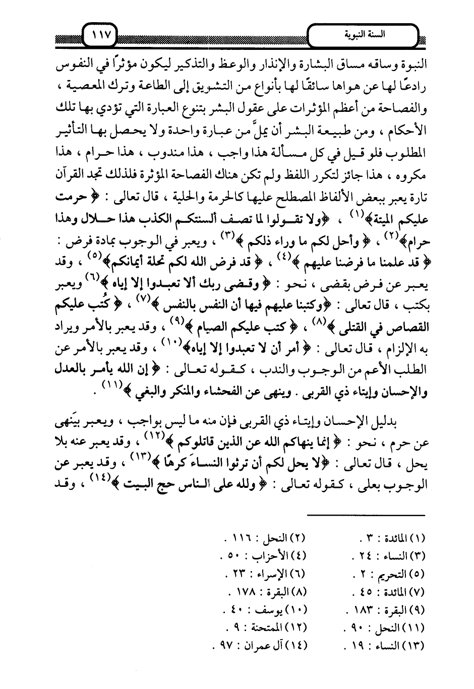 النبوة وساقه مساق البشارة والإنذار والوعظ والتذكير ليكون مؤثرًا في النقوس, رداعًا لها عن هواها, سائقًا لها بأنواعٍ من التشويق إلى الطاعة وترك المعصية، والفصاحة من أعظم المؤثرات على عقول البشر بتنوع العبارة التي تؤدى بها تلك الأحكام، ومن طبيعة البشر أن يملَّ من عبارة واحدة, ولا يحصل بها التأثير المطلوب, فلو قيل في كل مسألة: هذا واجب، هذا مندوب، هذا حرام، هذا مكروه، هذا جائز لتكرر اللفظ ولم تكن هناك الفصاحة المؤثرة, فلذلك تجد القرآن تارة يعبر ببعض الألفاظ المصطلح عليها كالحرمة والحلية، قال تعالى: {حُرِّمَتْ عَلَيْكُمُ الْمَيْتَةُ} 1، {وَلا تَقُولُوا لِمَا تَصِفُ أَلْسِنَتُكُمُ الْكَذِبَ هَذَا حَلالٌ وَهَذَا حَرَامٌ} 2، {وَأُحِلَّ لَكُمْ مَا وَرَاءَ ذَلِكُمْ} 3 ويعبر في الوجوب بمادة فرض: {قَدْ عَلِمْنَا مَا فَرَضْنَا عَلَيْهِمْ} 4، {قَدْ فَرَضَ اللَّهُ لَكُمْ تَحِلَّةَ أَيْمَانِكُمْ} 5، وقد يعبِّر عن فرض بقضى، نحو: {وَقَضَى رَبُّكَ أَلَّا تَعْبُدُوا إِلَّا إِيَّاهُ} 6 ويعبر بكتب، قال تعالى: {وَكَتَبْنَا عَلَيْهِمْ فِيهَا أَنَّ النَّفْسَ بِالنَّفْسِ} 7، {كُتِبَ عَلَيْكُمُ الْقِصَاصُ فِي الْقَتْلَى} 8، {كُتِبَ عَلَيْكُمُ الصِّيَام} 9، وقد يعبِّر بالأمر ويراد به الإلزام، قال تعالى: {أَمَرَ أَلَّا تَعْبُدُوا إِلَّا إِيَّاهُ} 10، وقد يعبِّر بالأمر عن الطلب الأعم من الوجوب والندب، كقوله تعالى: {إِنَّ اللَّهَ يَأْمُرُ بِالْعَدْلِ وَالإِحْسَانِ وَإِيتَاءِ ذِي الْقُرْبَى وَيَنْهَى عَنِ الْفَحْشَاءِ وَالْمُنْكَرِ وَالْبَغْيِ} 11.