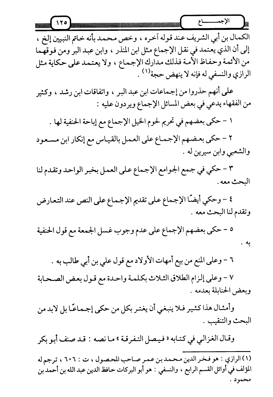 إلى أن الذي يعتمد في نقل الإجماع مثل ابن المنذر, وابن عبد البر, ومن فوقهما من الأئمة وحفاظ الأمة, فلذلك مدارك الإجماع، ولا يعتمد على حكاية مثل الرازي والنسفي له, فإنه لا ينهض حجة1.