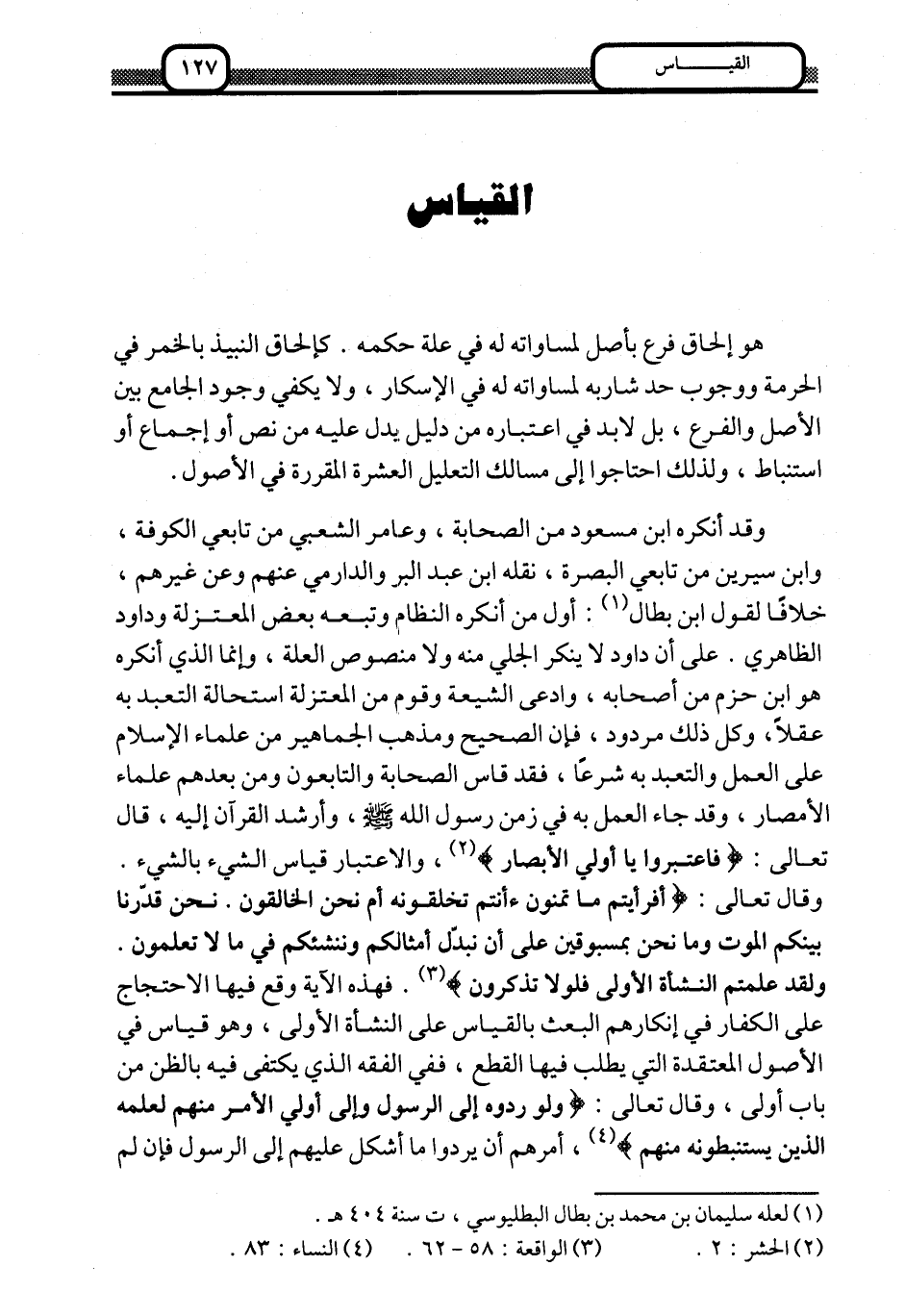 وقال تعالى: {أَفَرَأَيْتُمْ مَا تُمْنُونَ، أَأَنْتُمْ تَخْلُقُونَهُ أَمْ نَحْنُ الْخَالِقُونَ، نَحْنُ قَدَّرْنَا بَيْنَكُمُ الْمَوْتَ وَمَا نَحْنُ بِمَسْبُوقِينَ، عَلَى أَنْ نُبَدِّلَ أَمْثَالَكُمْ وَنُنْشِئَكُمْ فِي مَا لَا تَعْلَمُونَ، وَلَقَدْ عَلِمْتُمُ النَّشْأَةَ الْأُولَى فَلَوْلَا تَذَكَّرُونَ} 3. فهذه الآية وقع فيها الاحتجاج على الكفار في إنكارهم البعث بالقياس على النشأة الأولى، وهو قياس في الأصول المعتقدة التي يطلب فيه القطع، ففي الفقه الذي يكتفي فيه بالظن من باب أولى، وقال تعالى: {وَلَوْ رَدُّوهُ إِلَى الرَّسُولِ وَإِلَى أُولِي الأَمْرِ مِنْهُمْ لَعَلِمَهُ الَّذِينَ يَسْتَنْبِطُونَهُ مِنْهُمْ} 4، أمرهم أن يردوا ما أشكل عليهم إلى الرسول, فإن لم