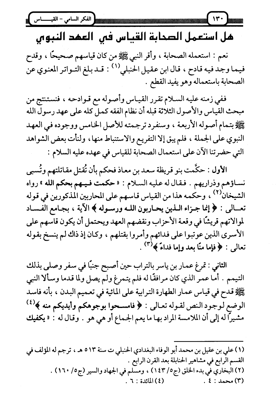 الأول: حكَّمت بنو قريظة سعد بن معاذ فحكم بأن تقتل مقاتلتم وتسبى نساؤهم وذراريهم, فقال له -عليه السلام: "حكمت فيهم بحكم الله" رواه الشيخان2، وحكمه هذا من القياس, قاسه على المحاربين المذكورين في قوله تعالى: {إِنَّمَا جَزَاءُ الَّذِينَ يُحَارِبُونَ اللَّهَ وَرَسُولَهُ} الآية، بجامع الفساد لموالاتهم قريشًا في وقعة الأحزاب, ونقضهم العهد, ويحتمل أن يكون قاسهم على الأسرى الذين عوتبوا على فدائهم, وأمروا بقتلهم، وكان إذ ذاك لم ينسخ بقوله تعالى: {فَإِمَّا مَنًّا بَعْدُ وَإِمَّا فِدَاءً} 3.