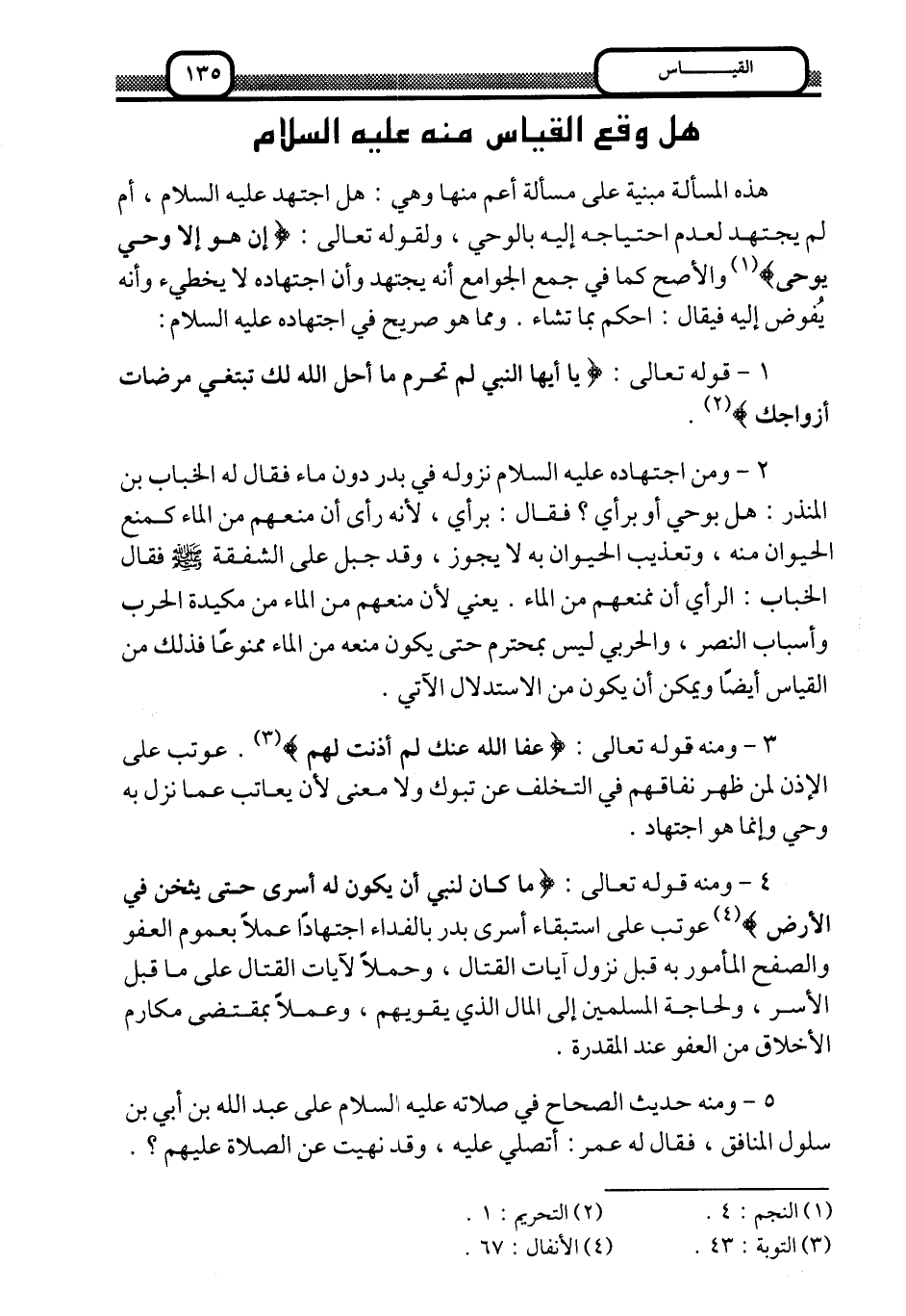 4- ومنه قوله تعالى: {مَا كَانَ لِنَبِيٍّ أَنْ يَكُونَ لَهُ أَسْرَى حَتَّى يُثْخِنَ فِي الْأَرْضِ} 4 عوتب على استبقاء أسرى بدر بالفداء اجتهادًا, عملًا بعموم العفو والصفح المأمور به قبل نزول آيات القتال، وحملًا لآيات القتال على ما قبل الأسر، ولحاجة المسلمين إلى المال الذي يقويهم، وعملًا بمقتضى مكارم الأخلاق من العفو عند المقدرة.